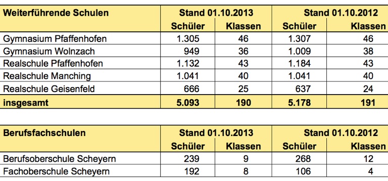 Aus der neuesten Statistik des Landratsamts geht hervor, dass im aktuellen Schuljahr im Schyren-Gymnasium Pfaffenhofen 1305 Schüler (Vorjahr: 1307) in 46 Klassen (Vorjahr: 46) unterrichtet werden, im Hallertau-Gymnasium Wolnzach 949 Schüler (1009) in 36 Klassen (38), in der Realschule Pfaffenhofen 1132 Schüler (1184) in 43 Klassen (43), in der Realschule Manching 1041 Schüler (1041) in 40 Klassen (40) und in der Realschule Geisenfeld 666 Schüler (637) in 25 Klassen (24). Die Klassenzahl hat sich gegenüber dem vergangenen Schuljahr um insgesamt eine verringert.