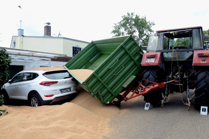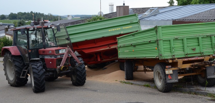 Es war gegen 13.25 Uhr, als es auf der Straße "Südring" mächtig gescheppert hat. Nach ersten Erkenntnissen war ein 26-Jähriger aus dem Gemeinde-Bereich von Haimhausen (Landkreis Dachau) mit dem landwirtschaftlichen Gespann, bestehend aus einem Traktor und zwei Anhängern, bergab unterwegs, als es zu dem Crash kam. Transportiert wurde tonnenweise Getreide, doch die Tour sollte ein jähes Ende finden.