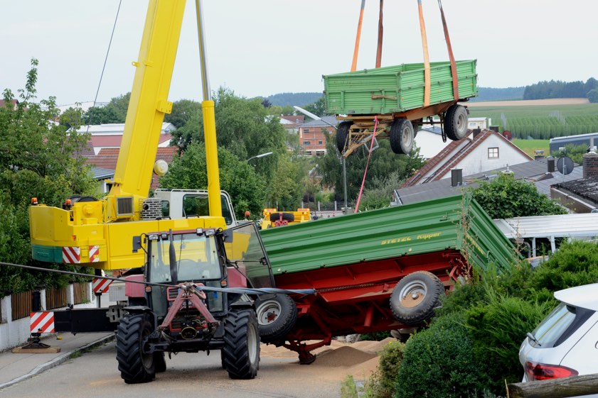Schwerste Fahrzeuge, darunter ein großer Kran, mussten anrücken, um das Malheur zu beseitigen. Auch die örtliche Feuerwehr und der Bauhof waren im Einsatz. Bei den Bergungs-Arbeiten kam es zu fast schon bizarren Szenen – als zum Beispiel der havarierte Anhänger meterhoch durch die Luft schwebte. Erst gegen 17.30 Uhr war der Großteil der Bergungs-Arbeiten beendet. Zurück blieben zwei demolierte Pkw, die in einem Getreide-Haufen standen. Inzwischen liegen weitere Informationen vor; lesen Sie dazu: Weitere Details zu dem heftigen Traktor-Unglück in Schweitenkirchen