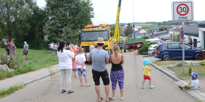 Es gab aber auch Versöhnliches: Eine Frau brachte dem 26-jährigen Traktor-Fahrer, dessen Zerknirschtheit man nach diesem krassen Unfall wohl nur erahnen kann, ein belegtes Brot. Er nahm es an und aß es. Bis zum Schluss war der junge Mann vor Ort und verfolgte die aufwändigen Bergungs-Arbeiten. Diese Maßnahmen zogen die Blicke freilich auf sich. Zahlreiche Leute fanden sich ein, um das Treiben live zu verfolgen.
