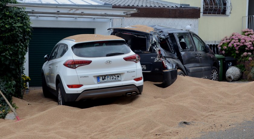 Der entstandene Sachschaden ist massiv. Denn durch das Geschehen war der erste Anhänger – auch er wurde demoliert – umgekippt und gegen zwei geparkte Pkw gekracht. Ein Carport wurde augenscheinlich ebenfalls in Mitleidenschaft gezogen. Tonnen von Getreide rasselten aus dem Anhänger, landeten auf der Straße, auf und an den Autos. Das Wichtigste aber: Der 26-jährige Traktor-Lenker kam nach Angaben der Polizei mit dem Schrecken davon, blieb körperlich unversehrt. Und auch sonst ist niemand verletzt worden.