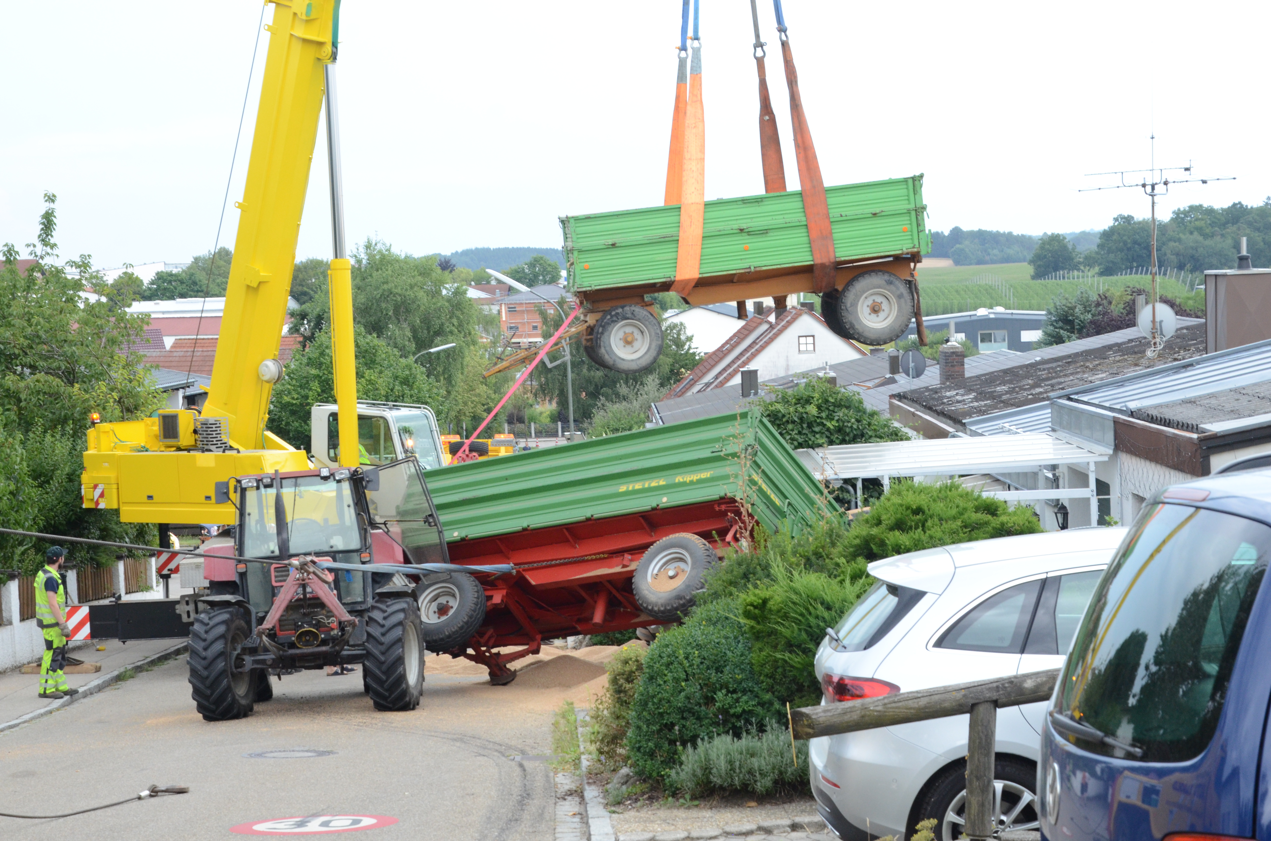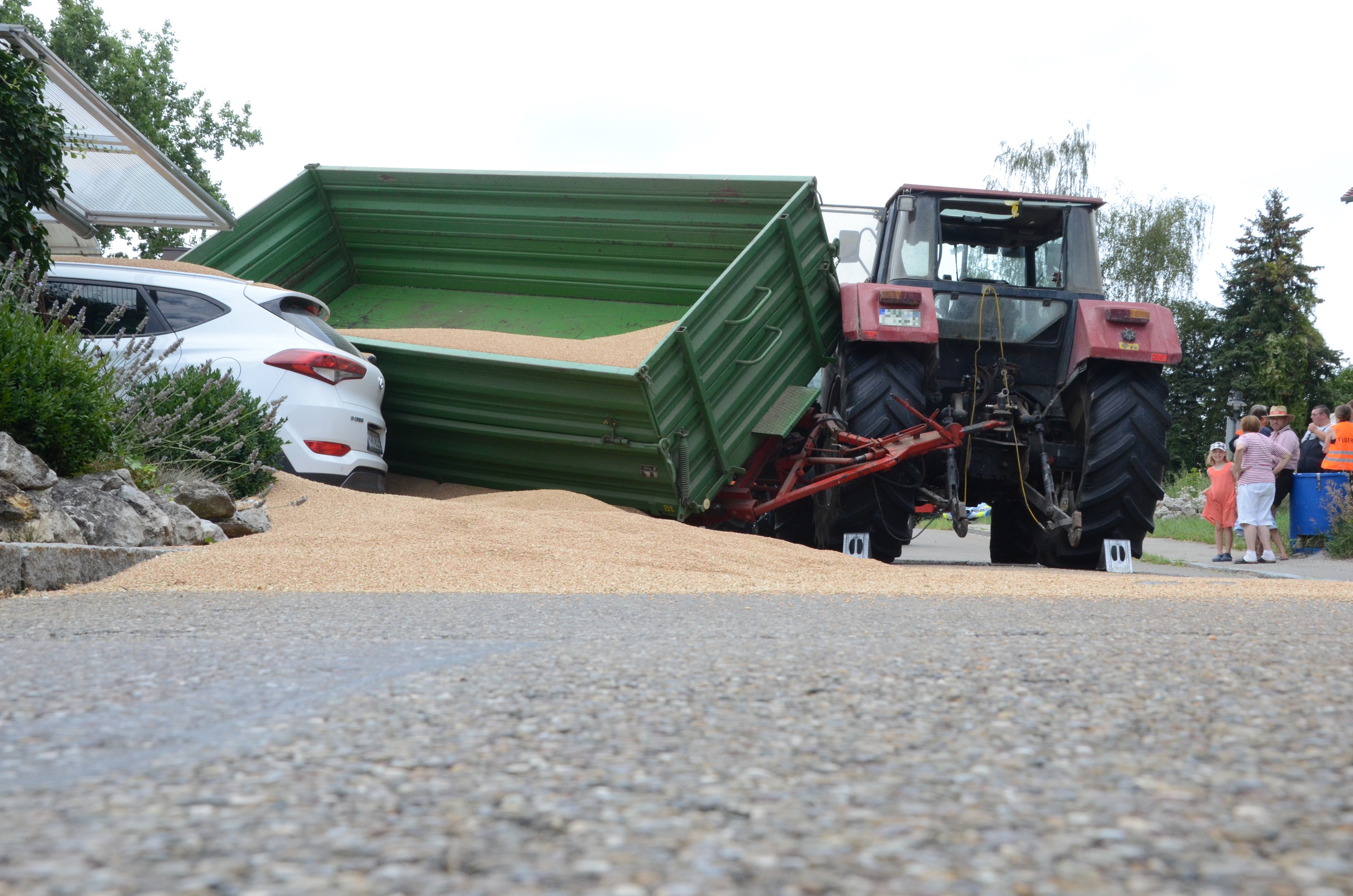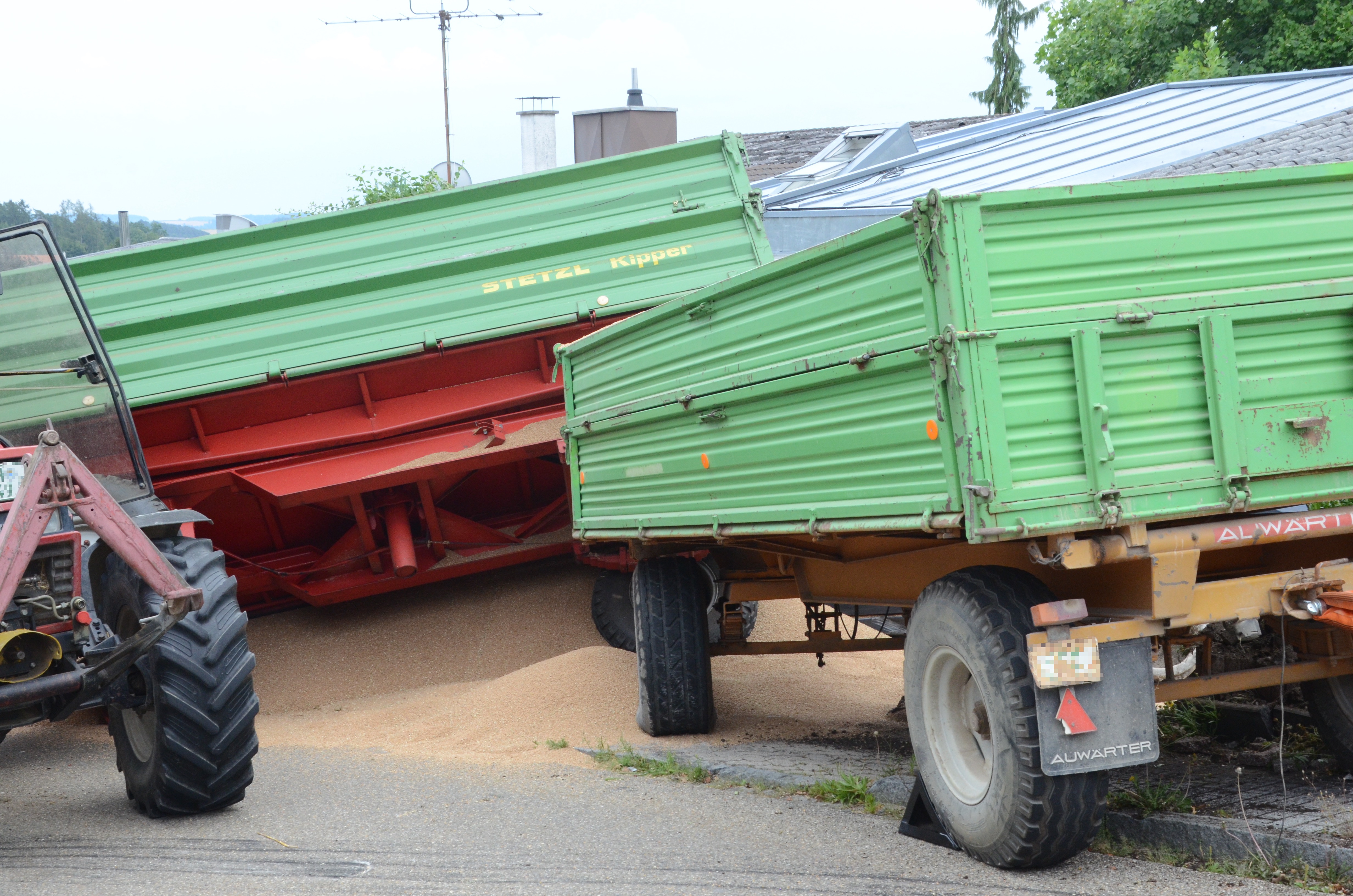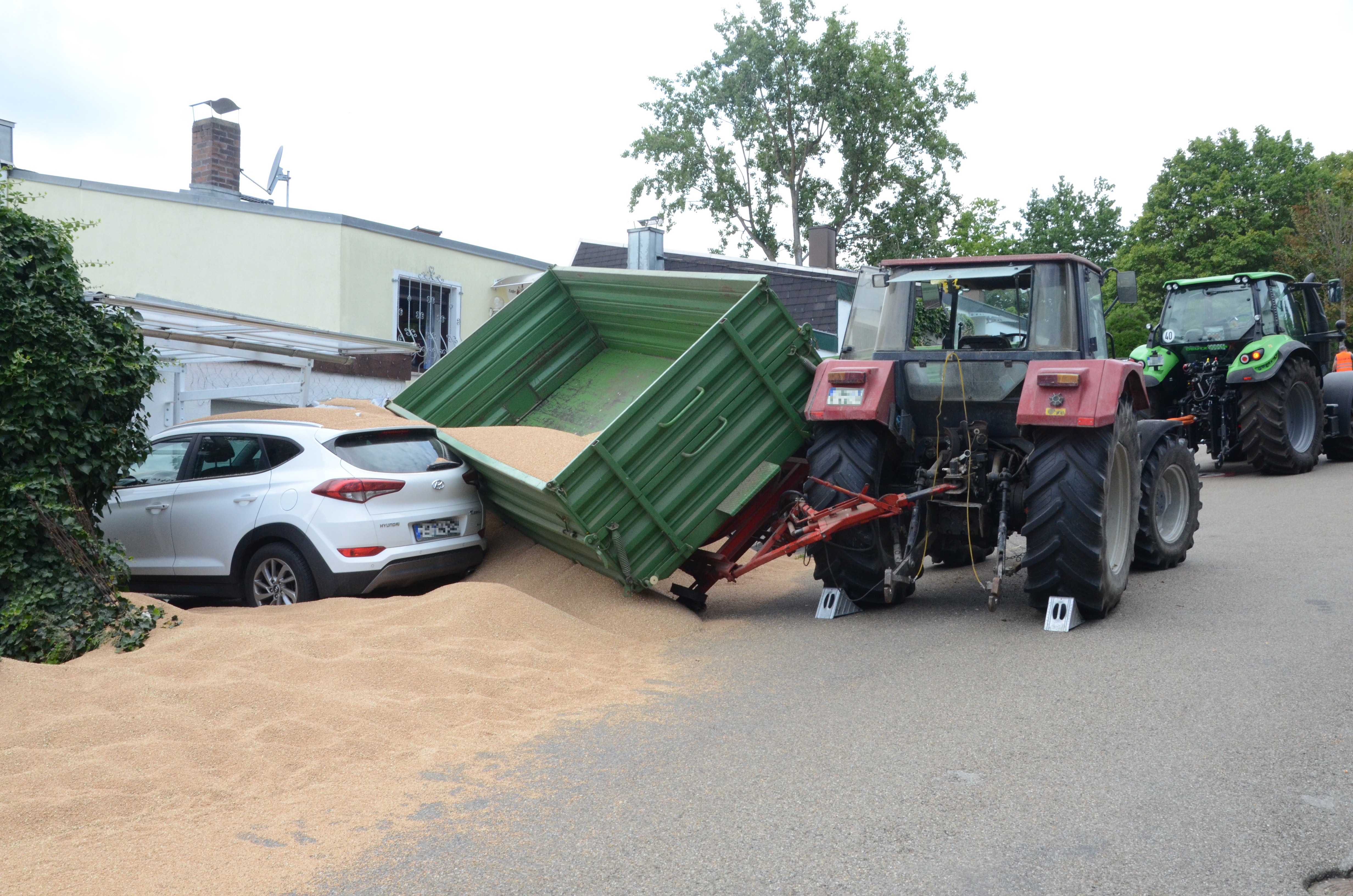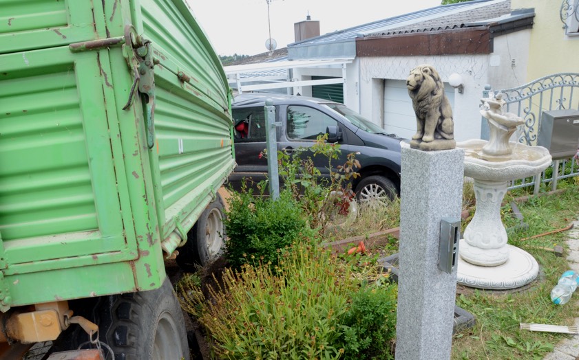 Dieses verkeilte sich schließlich ineinander; letztlich kam der Traktor entgegen der eigentlichen Fahrtrichtung zum Stehen. Der erste der beiden Anhänger kippte um und kollidierte mit zwei – in Fahrtrichtung gesehen – rechts neben der Straße auf einem Privat-Anwesen geparkten Autos. Zum Glück befanden sich hier zum Unglücks-Zeitpunkt keine Personen. Und auch der Traktor-Fahrer kam mit dem Schrecken davon. So wurde niemand verletzt.