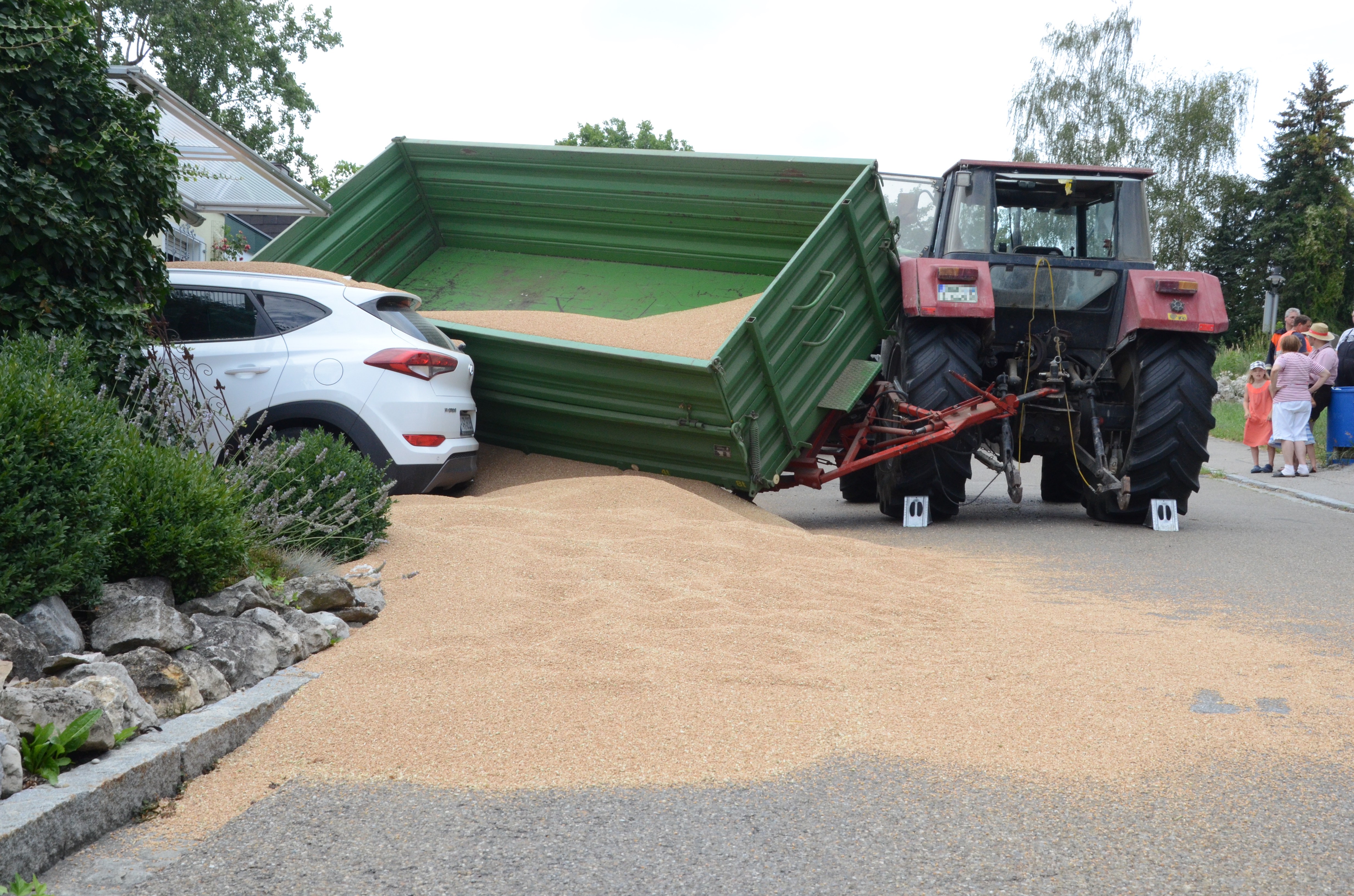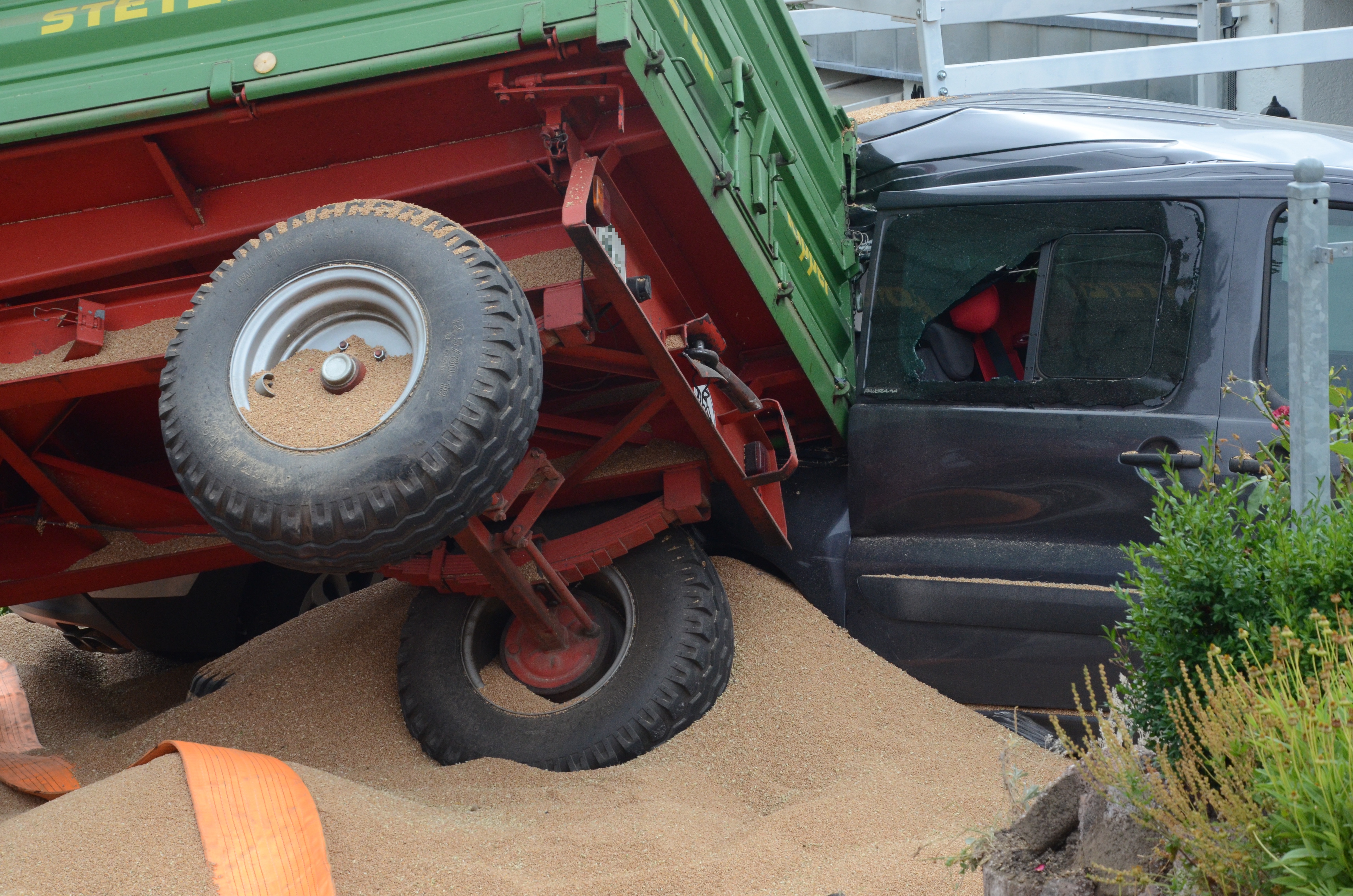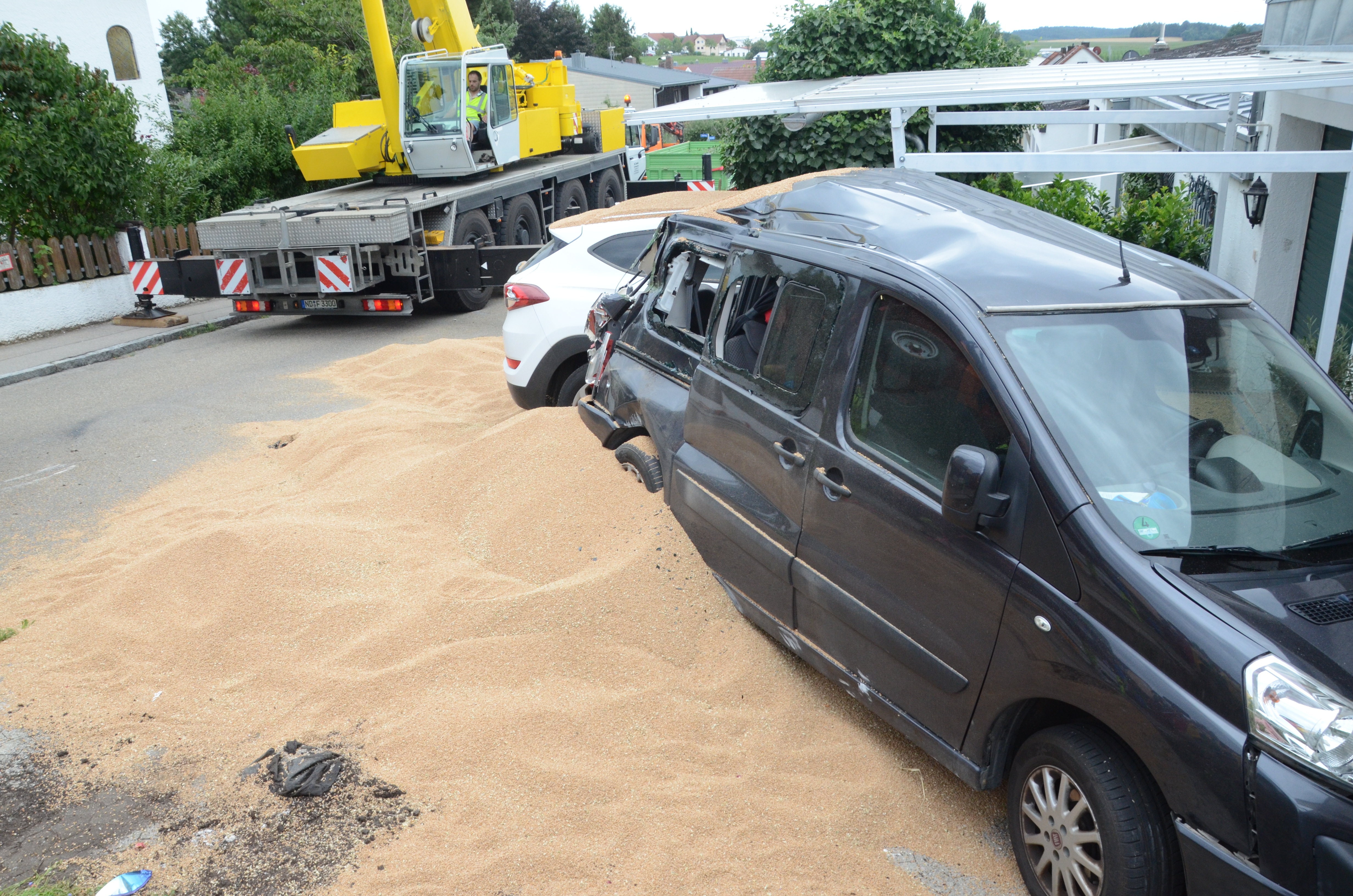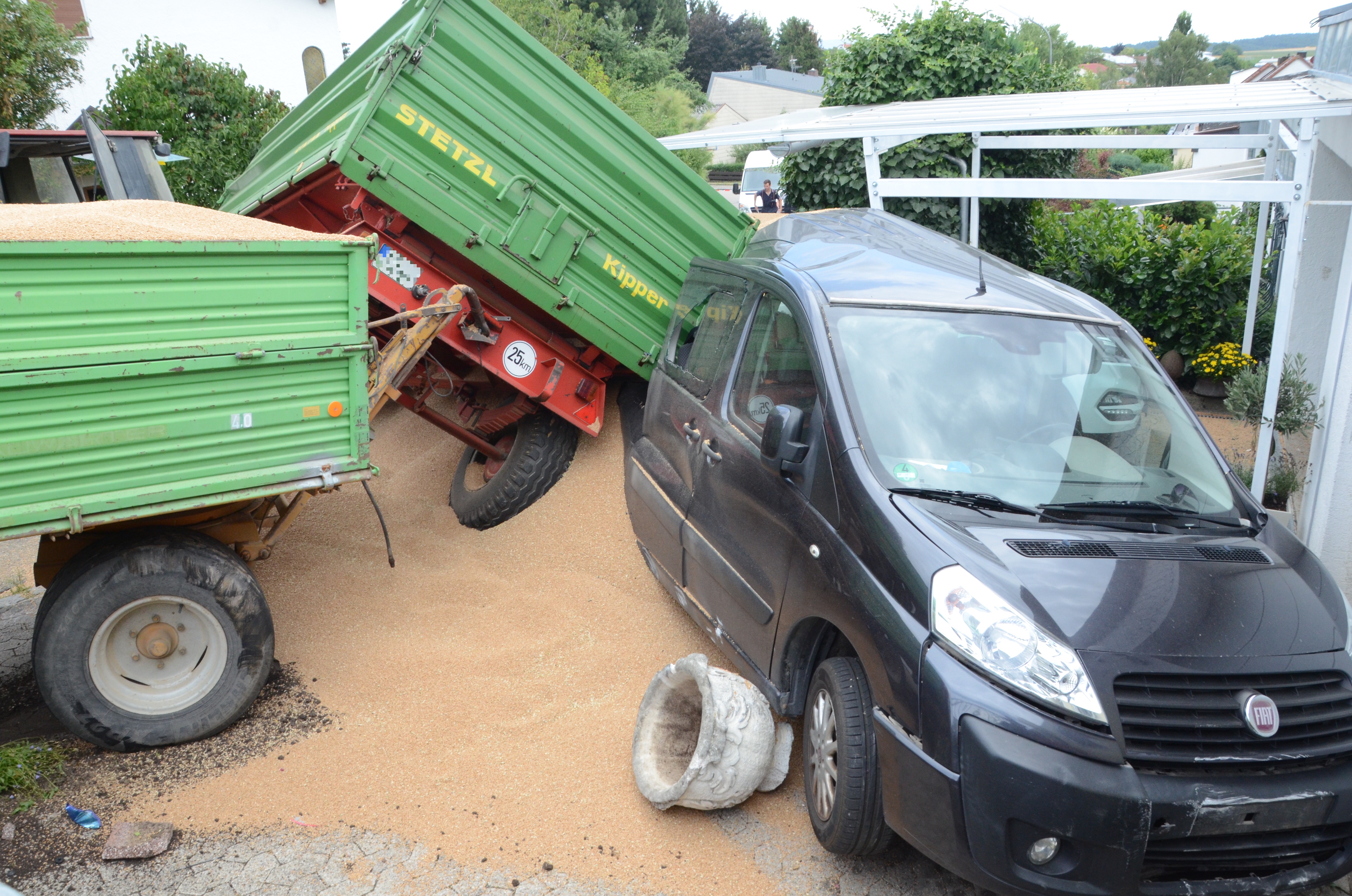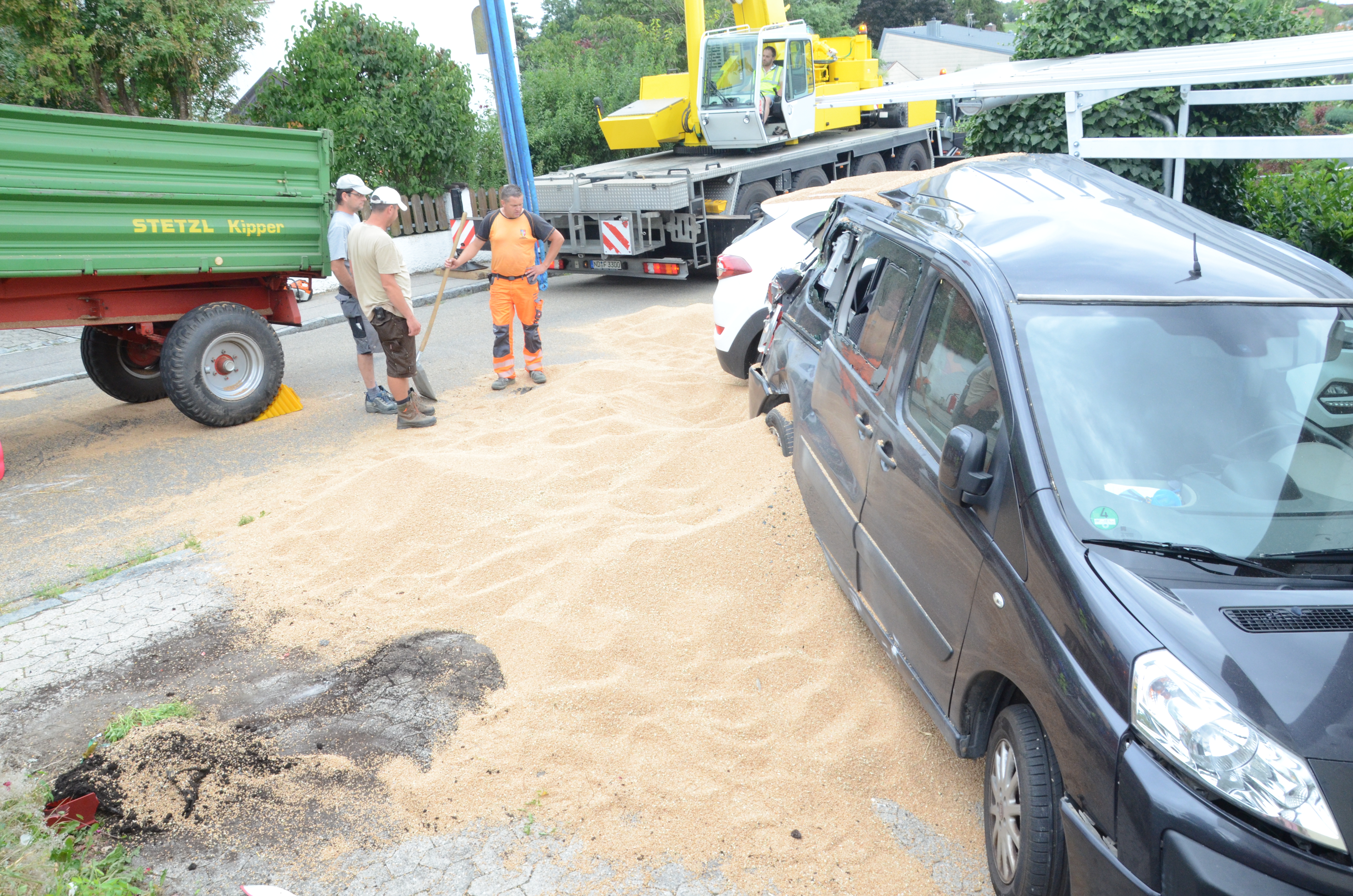 Dieses verkeilte sich schließlich ineinander; letztlich kam der Traktor entgegen der eigentlichen Fahrtrichtung zum Stehen. Der erste der beiden Anhänger kippte um und kollidierte mit zwei – in Fahrtrichtung gesehen – rechts neben der Straße auf einem Privat-Anwesen geparkten Autos. Zum Glück befanden sich hier zum Unglücks-Zeitpunkt keine Personen. Und auch der Traktor-Fahrer kam mit dem Schrecken davon. So wurde niemand verletzt.