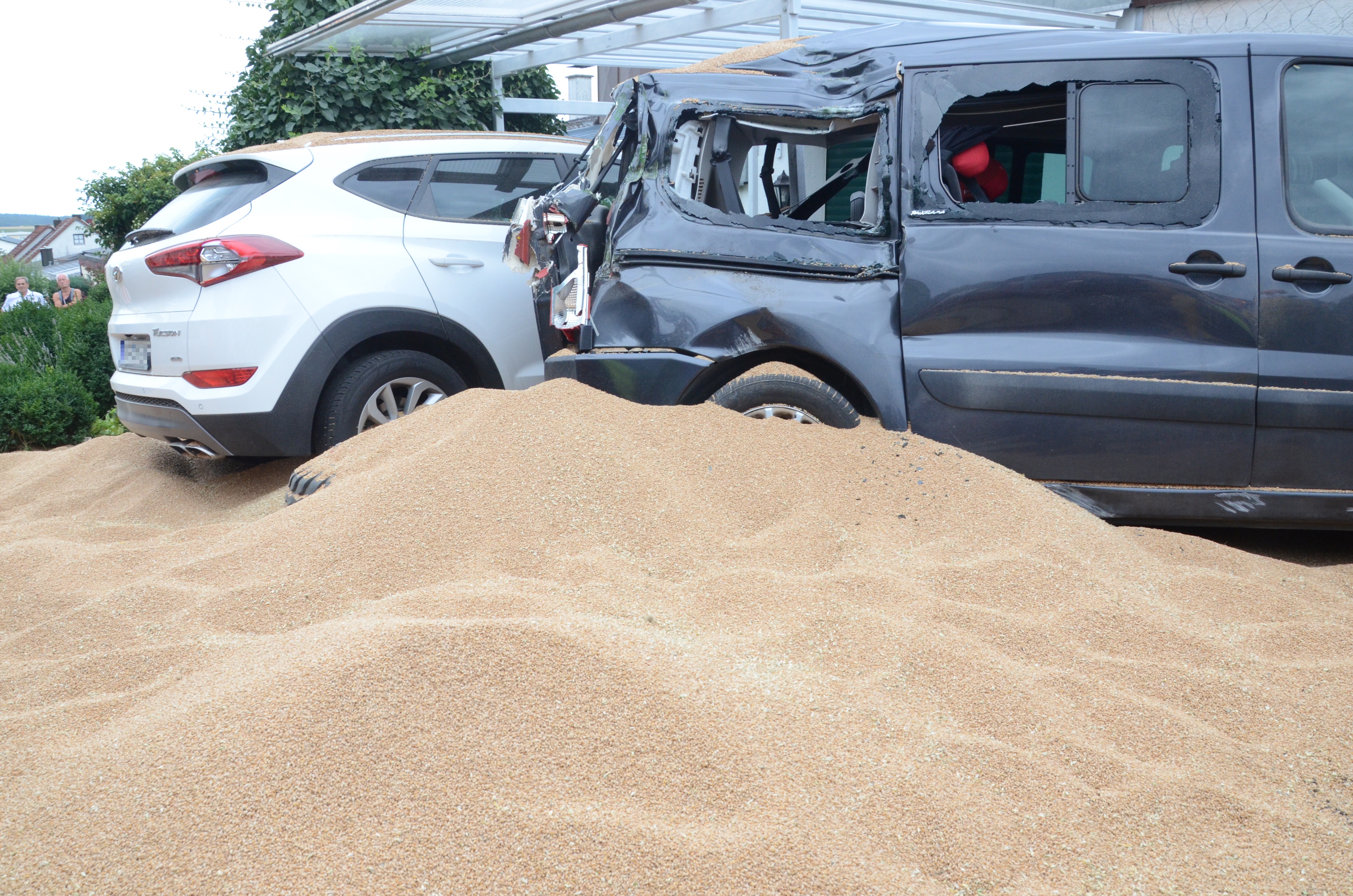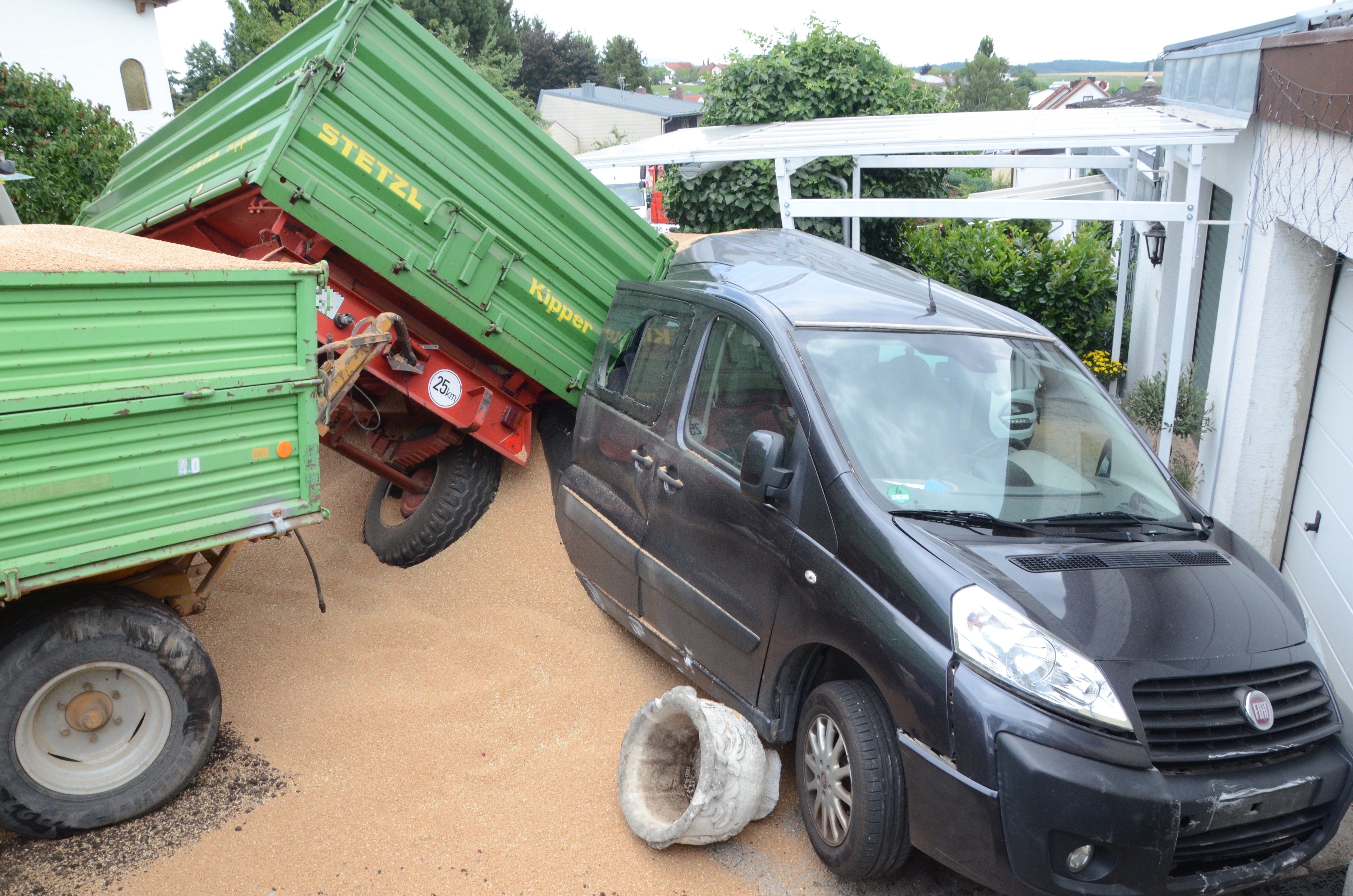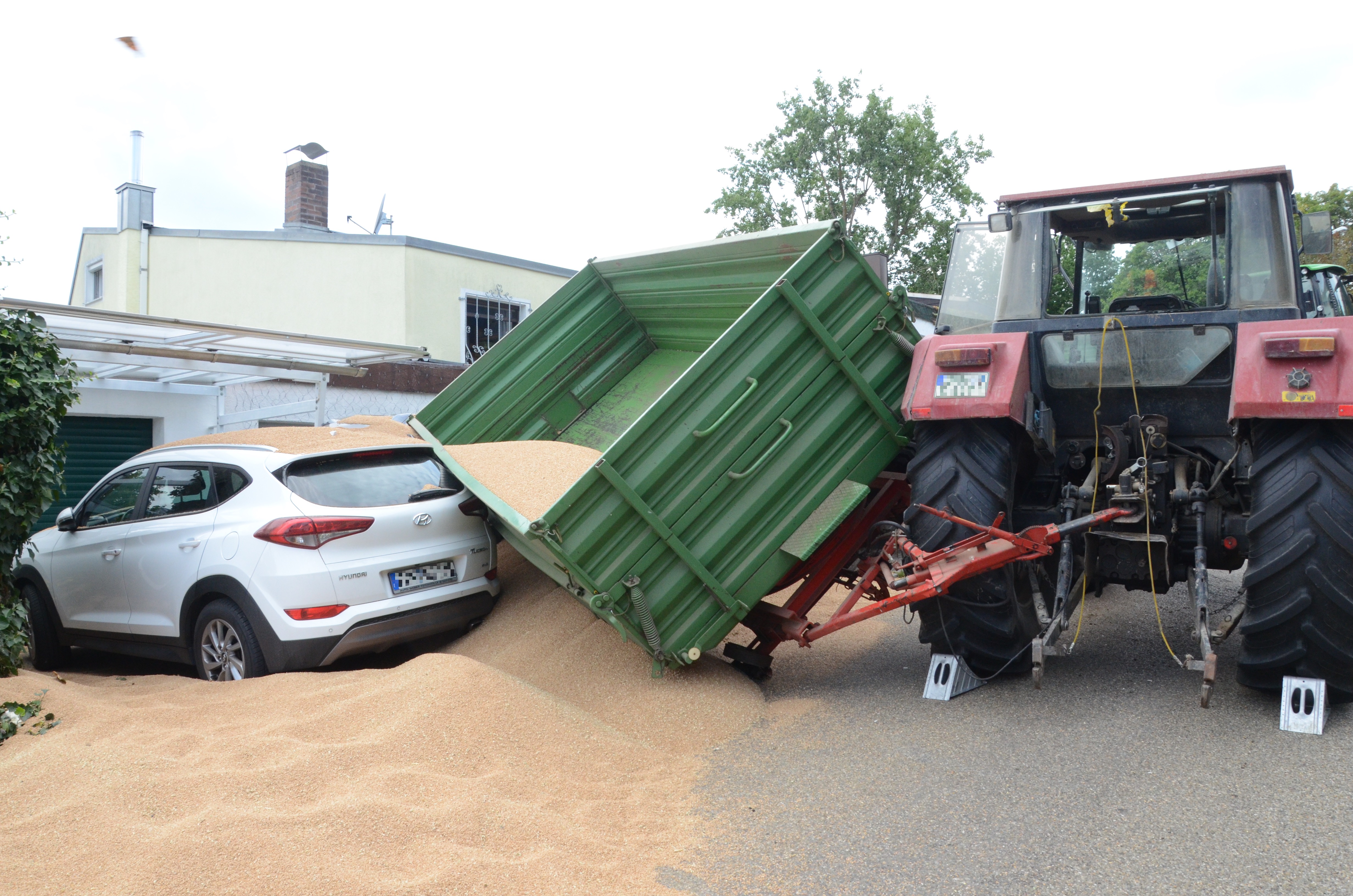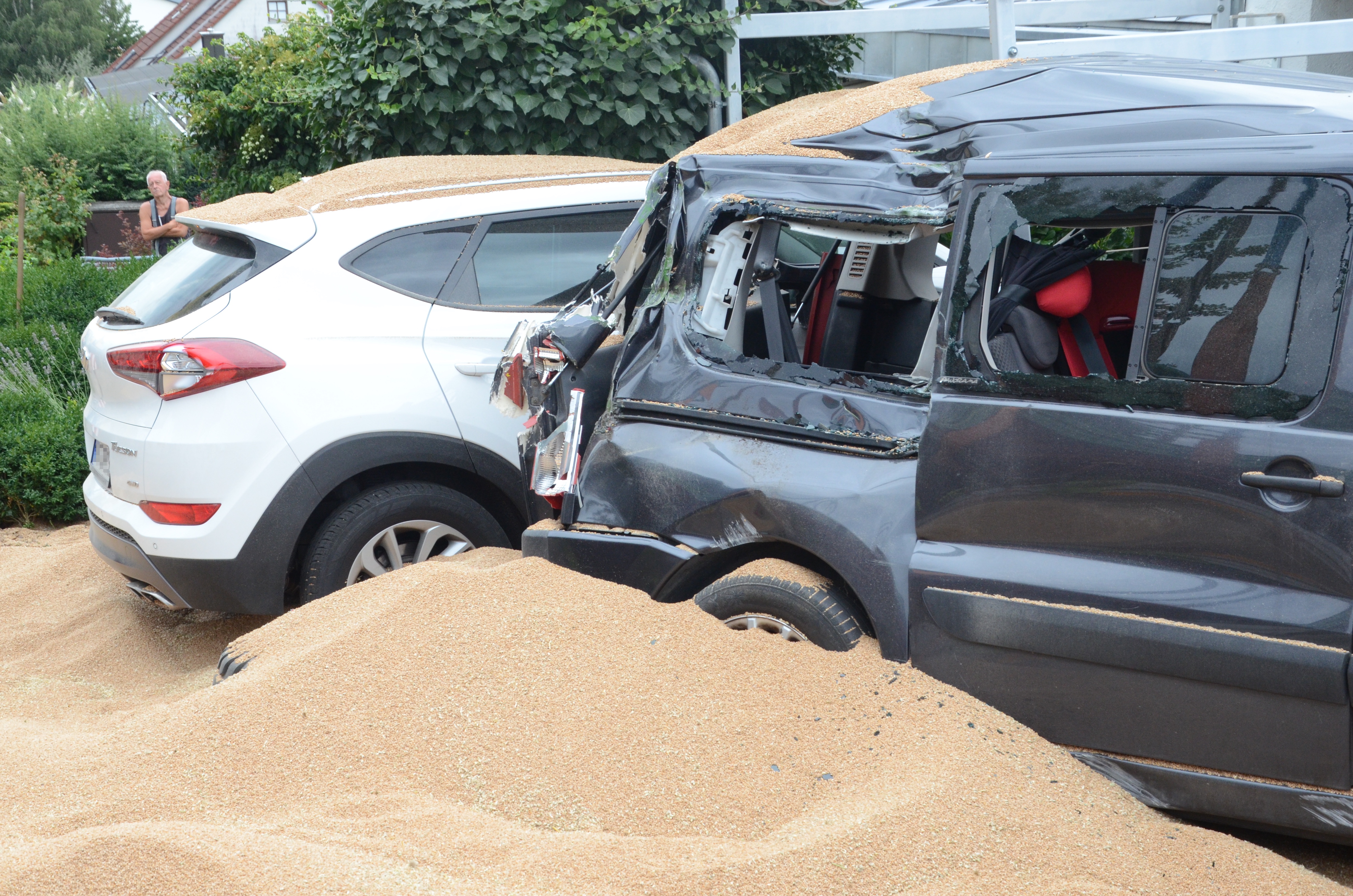 Dieses verkeilte sich schließlich ineinander; letztlich kam der Traktor entgegen der eigentlichen Fahrtrichtung zum Stehen. Der erste der beiden Anhänger kippte um und kollidierte mit zwei – in Fahrtrichtung gesehen – rechts neben der Straße auf einem Privat-Anwesen geparkten Autos. Zum Glück befanden sich hier zum Unglücks-Zeitpunkt keine Personen. Und auch der Traktor-Fahrer kam mit dem Schrecken davon. So wurde niemand verletzt.