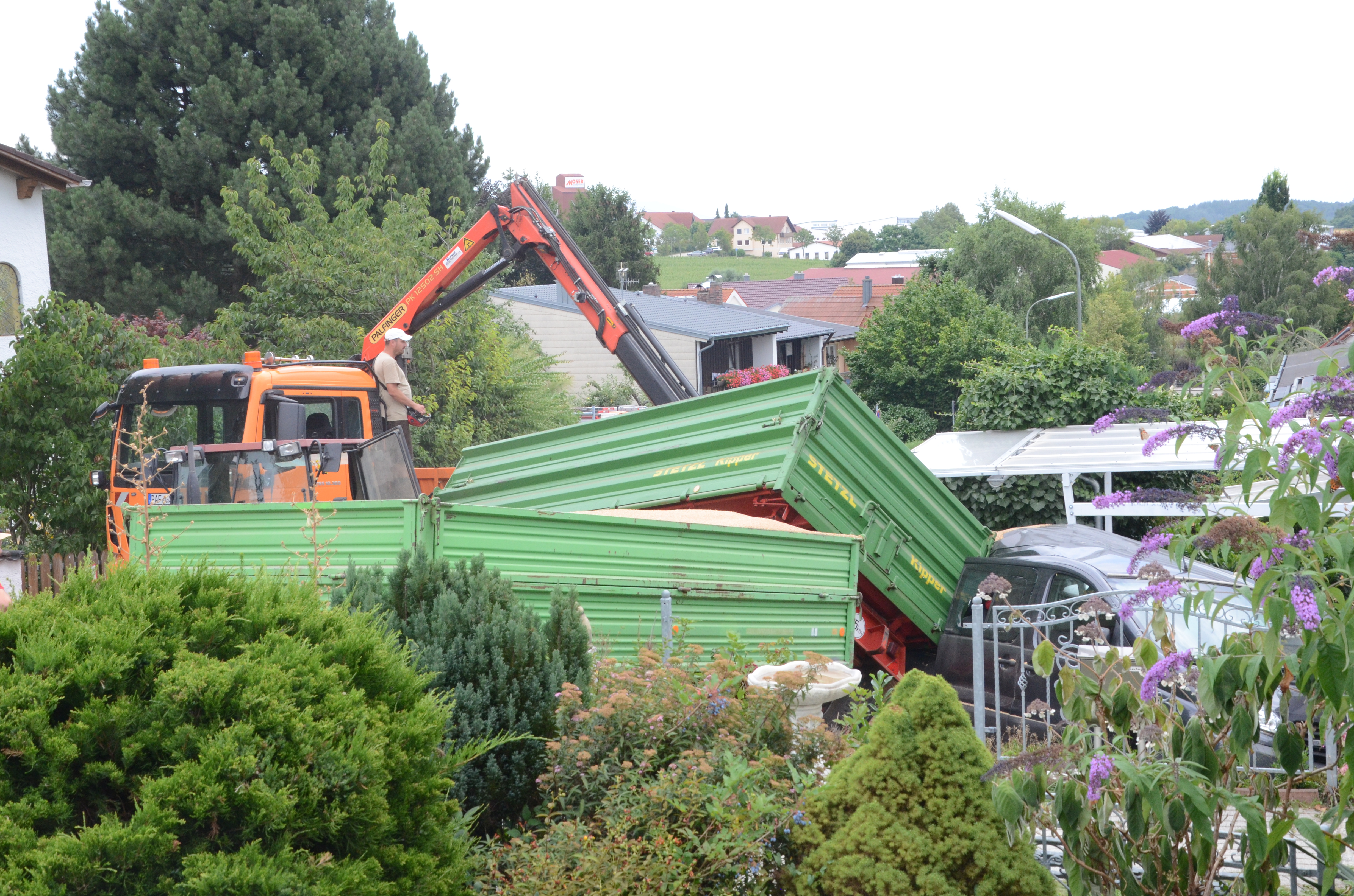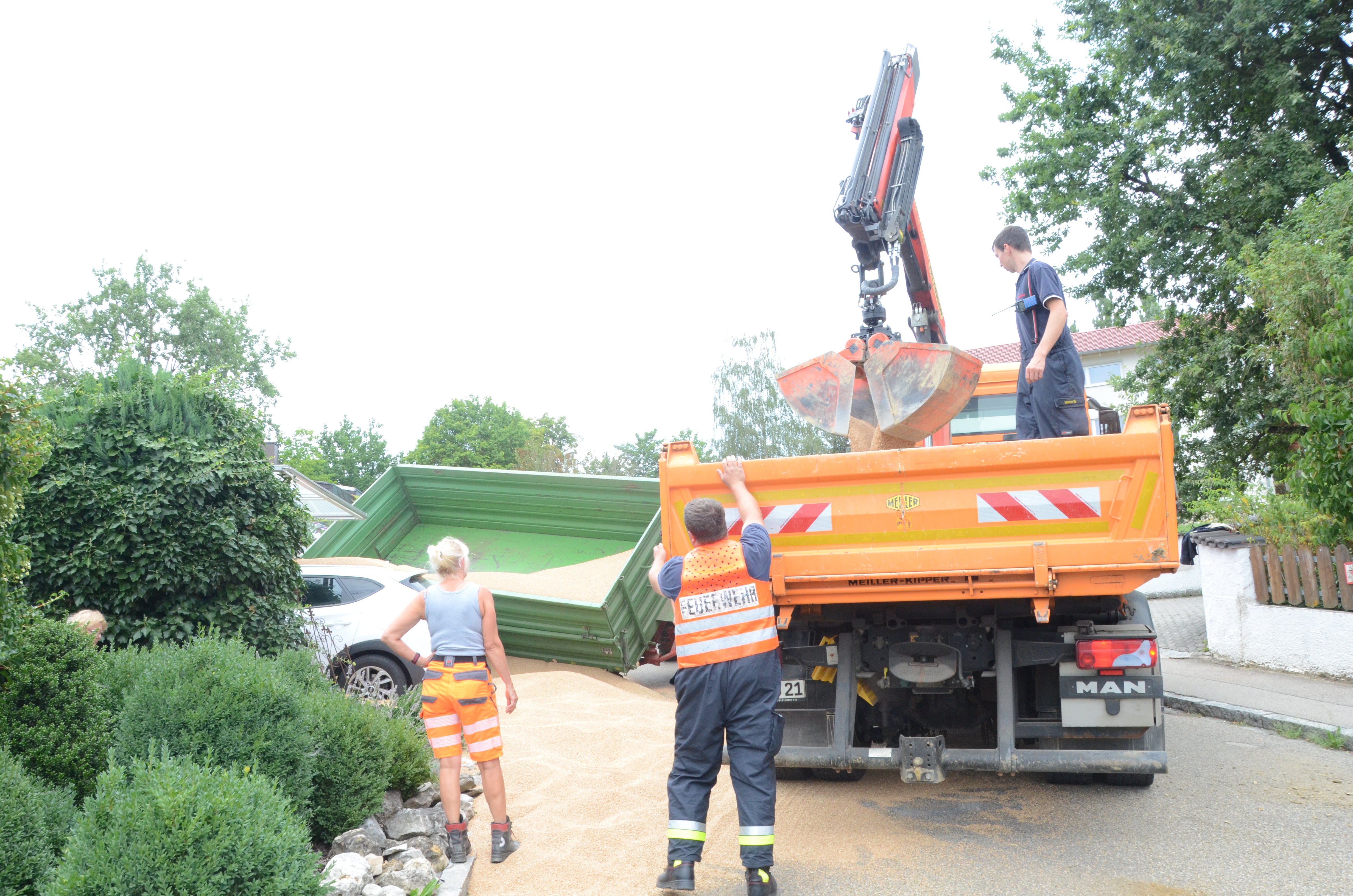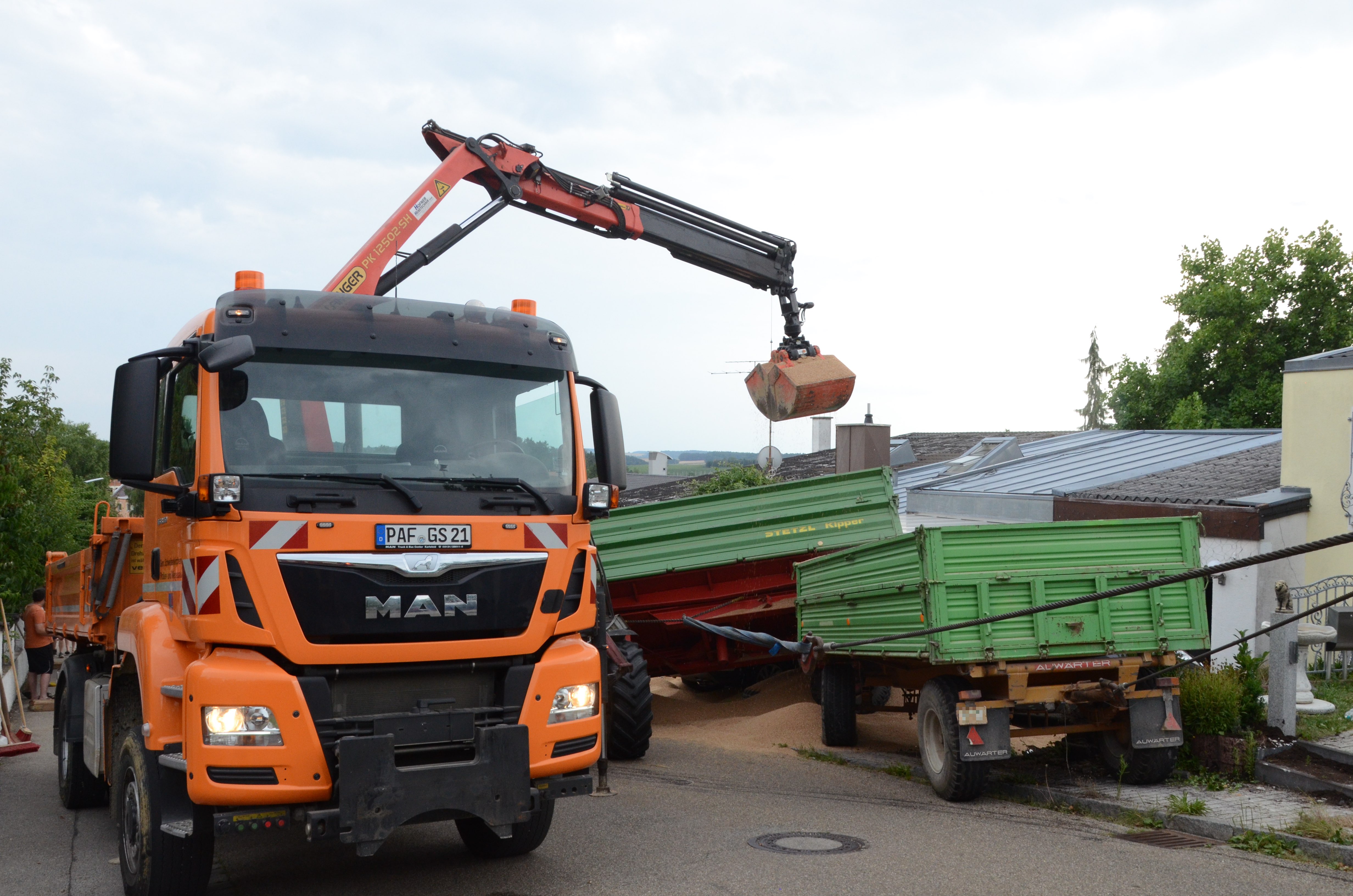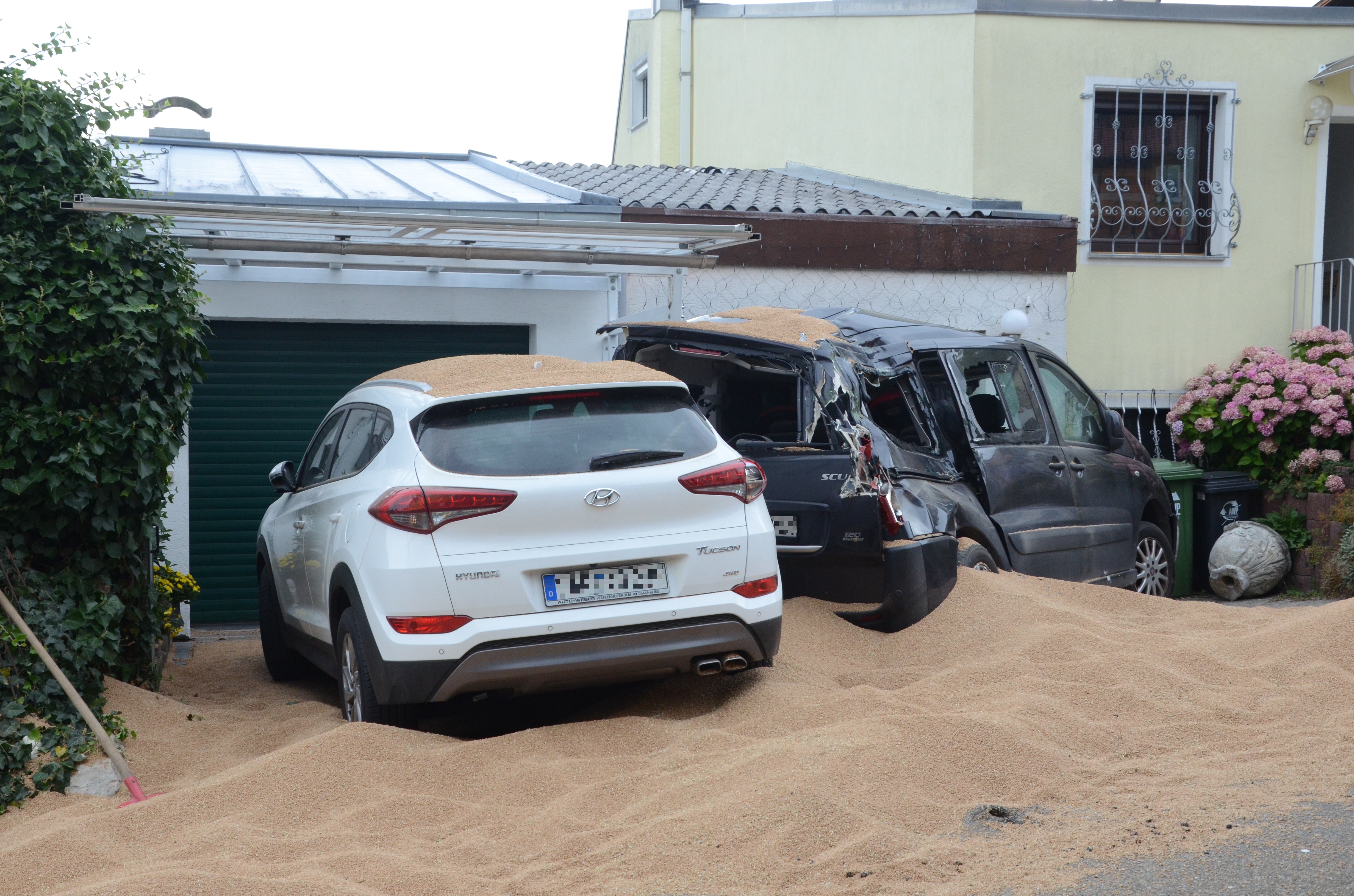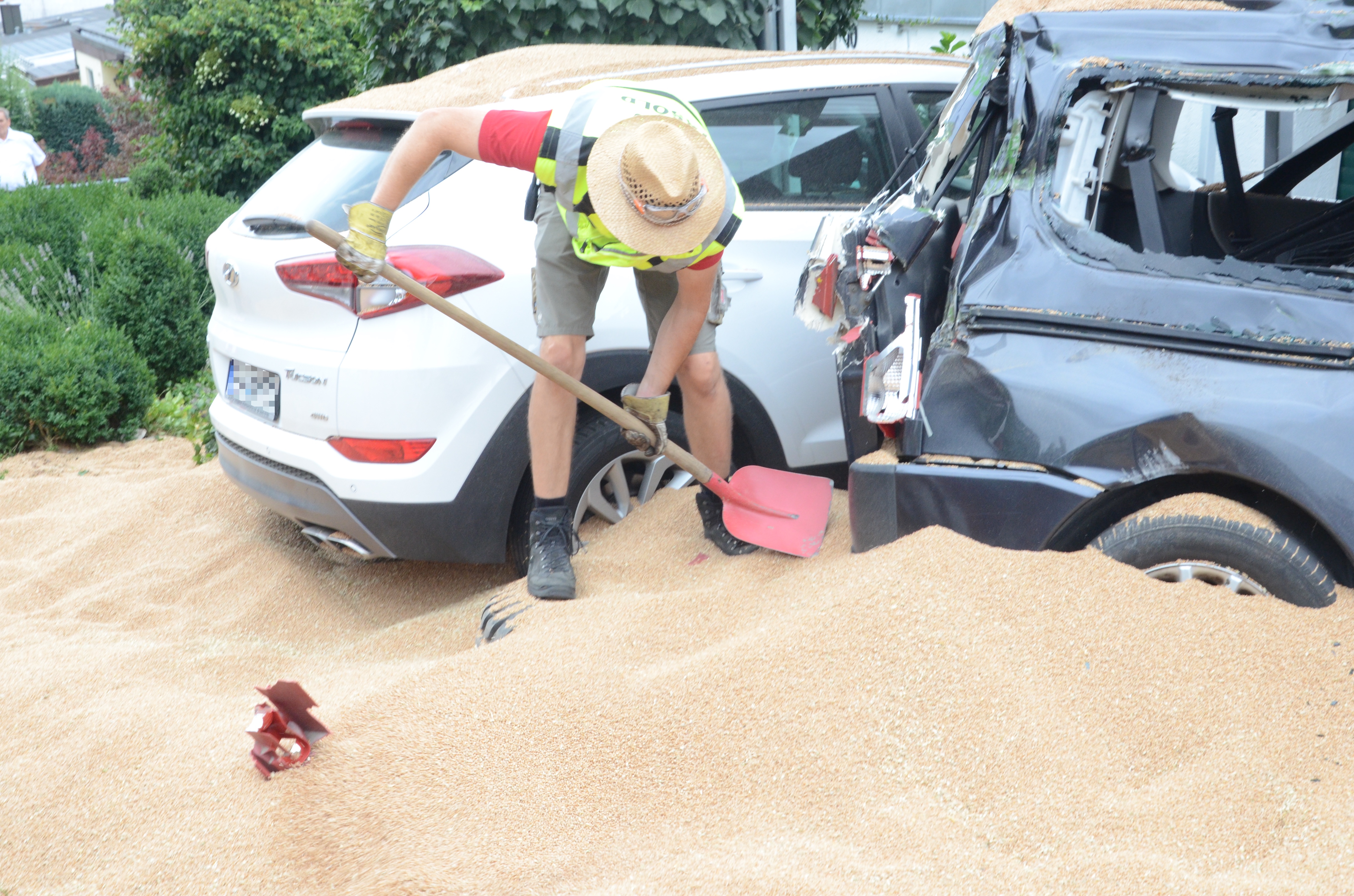 Dieses verkeilte sich schließlich ineinander; letztlich kam der Traktor entgegen der eigentlichen Fahrtrichtung zum Stehen. Der erste der beiden Anhänger kippte um und kollidierte mit zwei – in Fahrtrichtung gesehen – rechts neben der Straße auf einem Privat-Anwesen geparkten Autos. Zum Glück befanden sich hier zum Unglücks-Zeitpunkt keine Personen. Und auch der Traktor-Fahrer kam mit dem Schrecken davon. So wurde niemand verletzt.