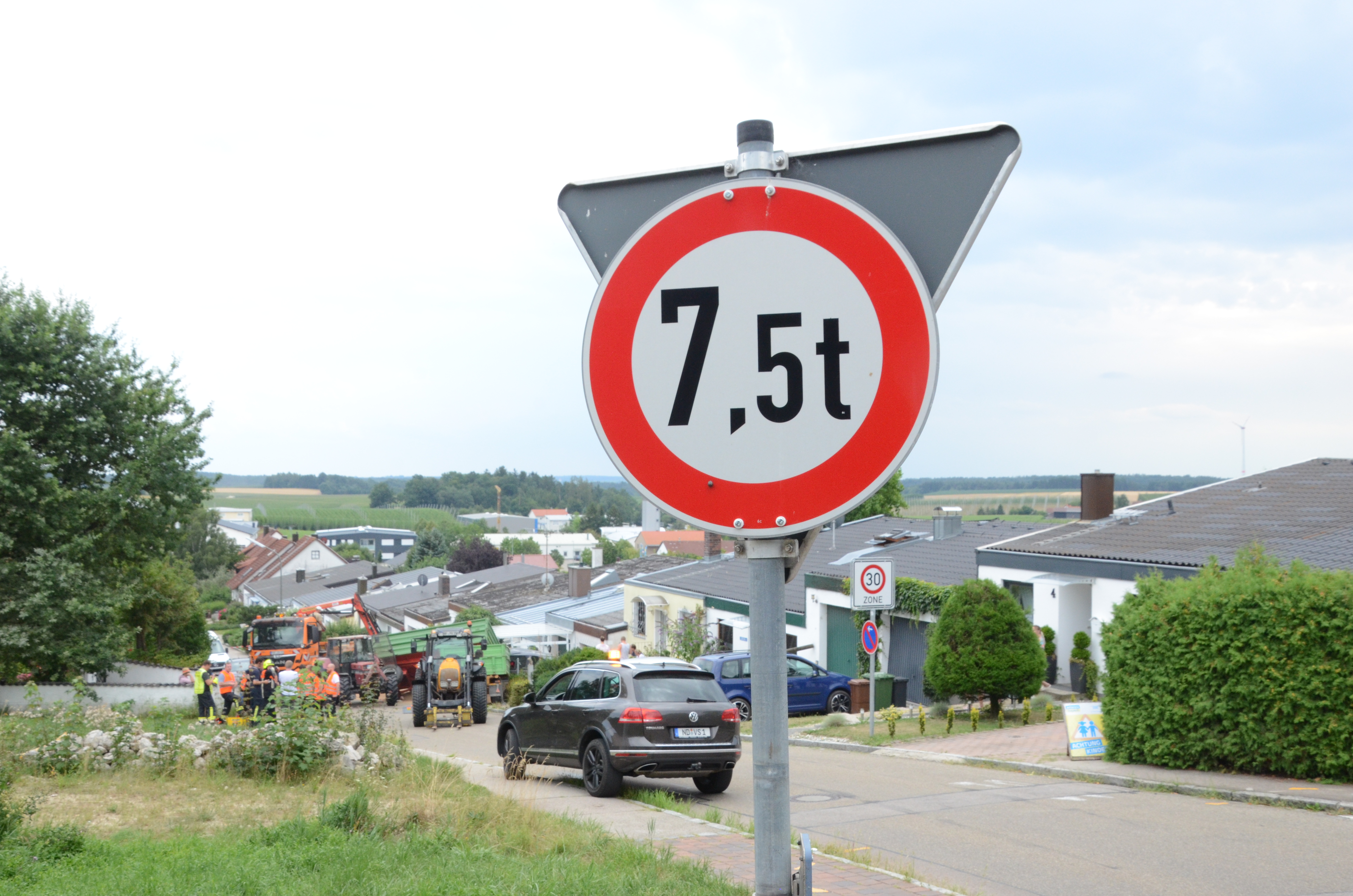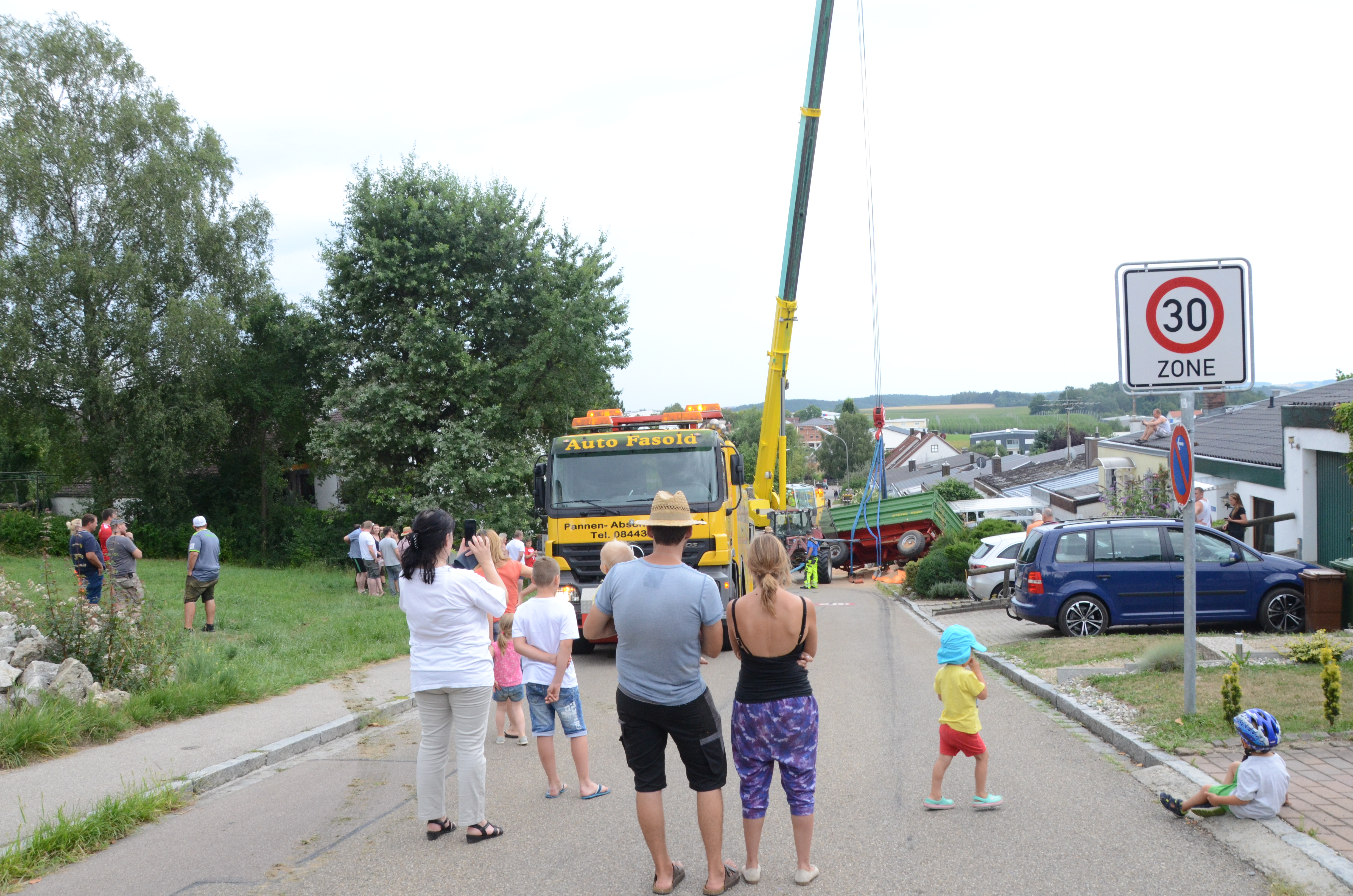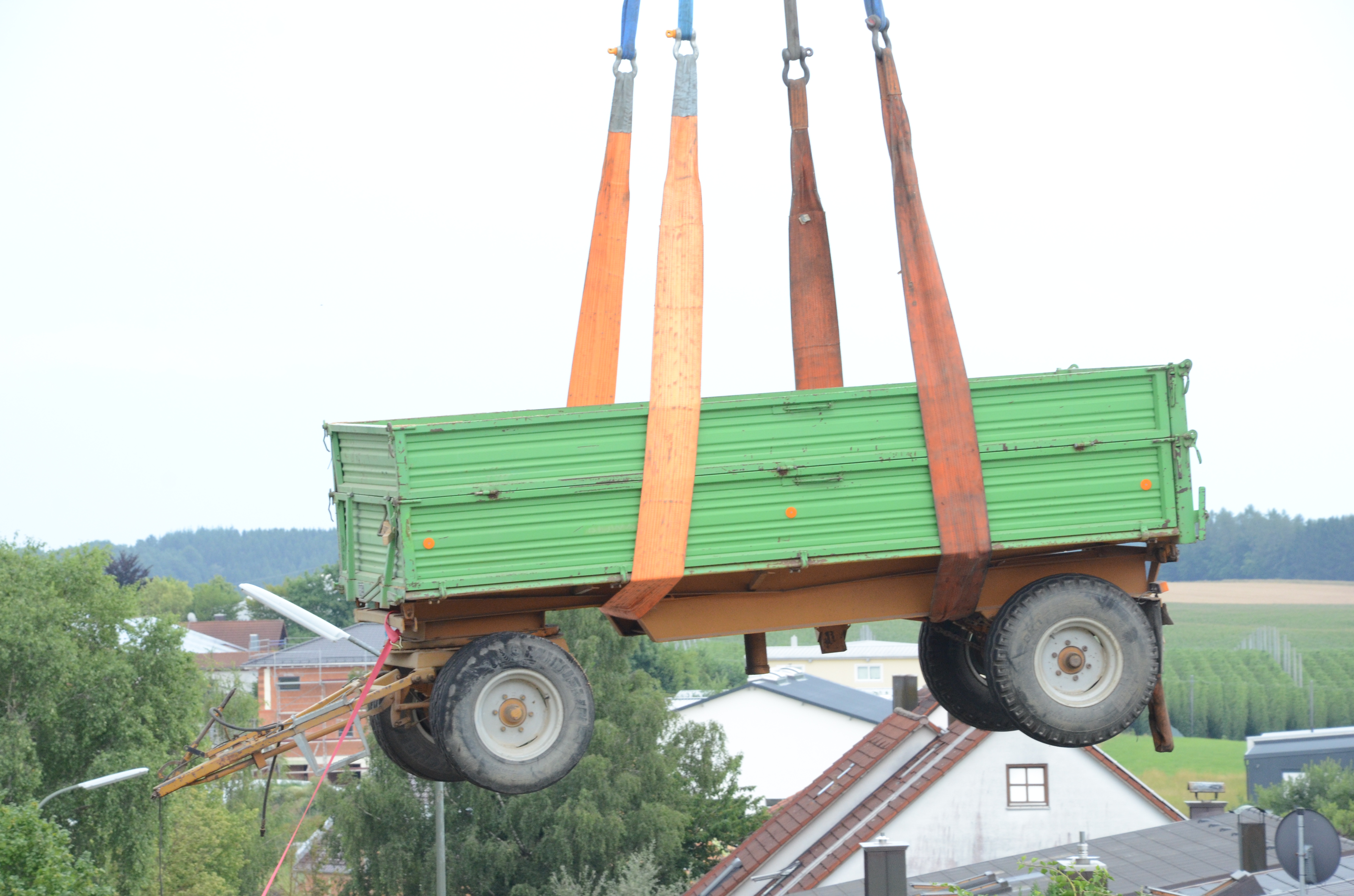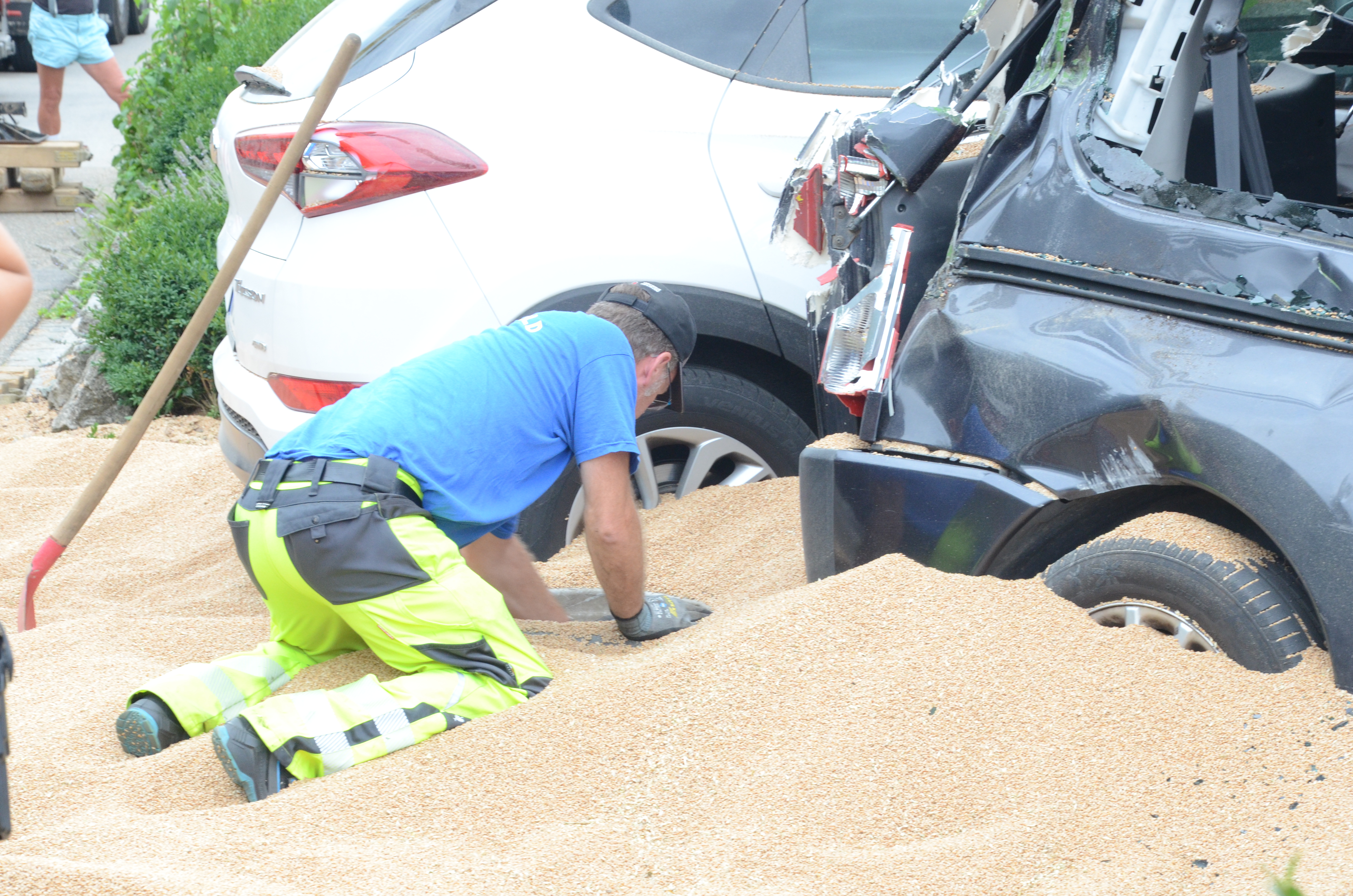 Dieses verkeilte sich schließlich ineinander; letztlich kam der Traktor entgegen der eigentlichen Fahrtrichtung zum Stehen. Der erste der beiden Anhänger kippte um und kollidierte mit zwei – in Fahrtrichtung gesehen – rechts neben der Straße auf einem Privat-Anwesen geparkten Autos. Zum Glück befanden sich hier zum Unglücks-Zeitpunkt keine Personen. Und auch der Traktor-Fahrer kam mit dem Schrecken davon. So wurde niemand verletzt.