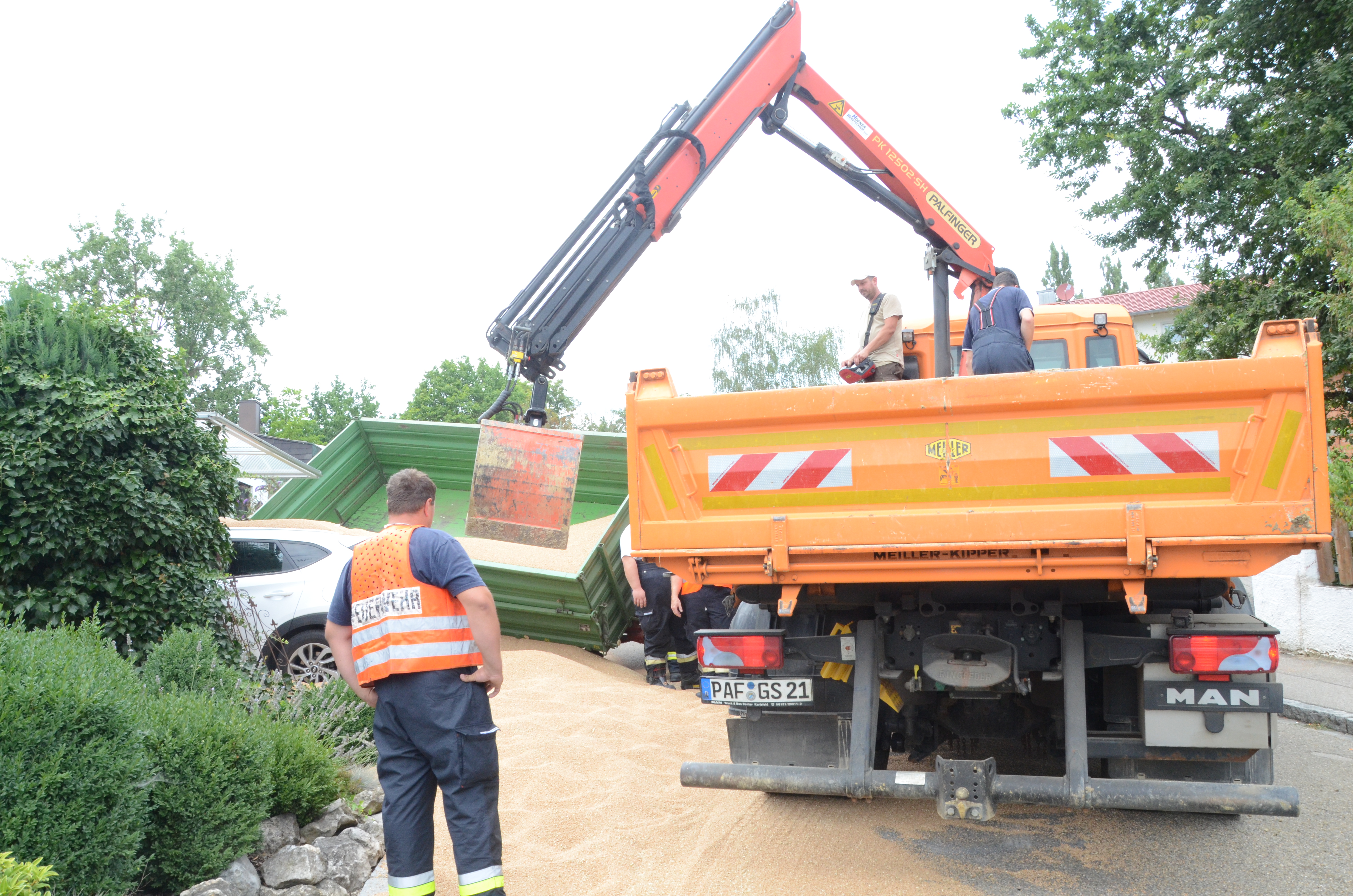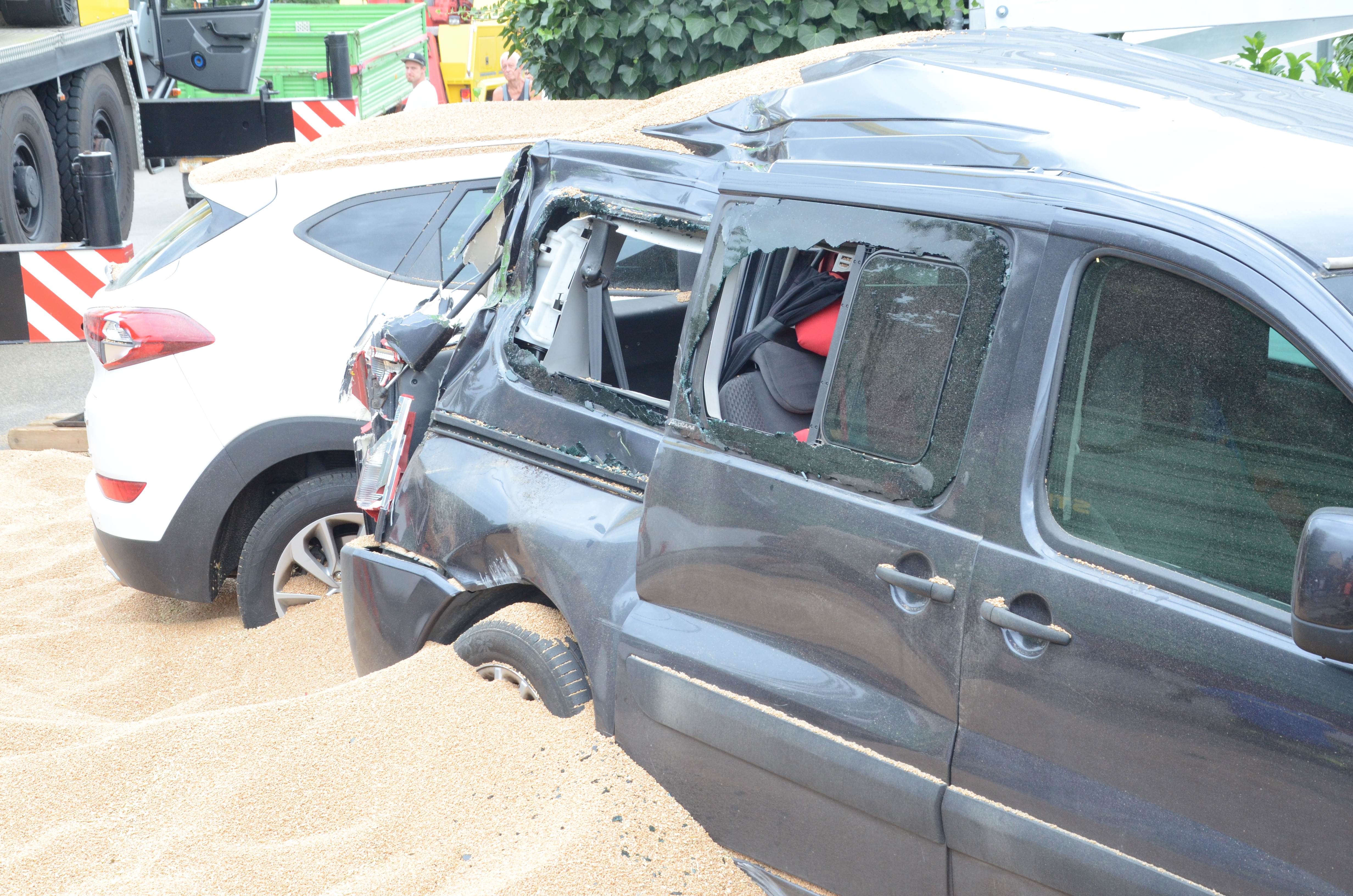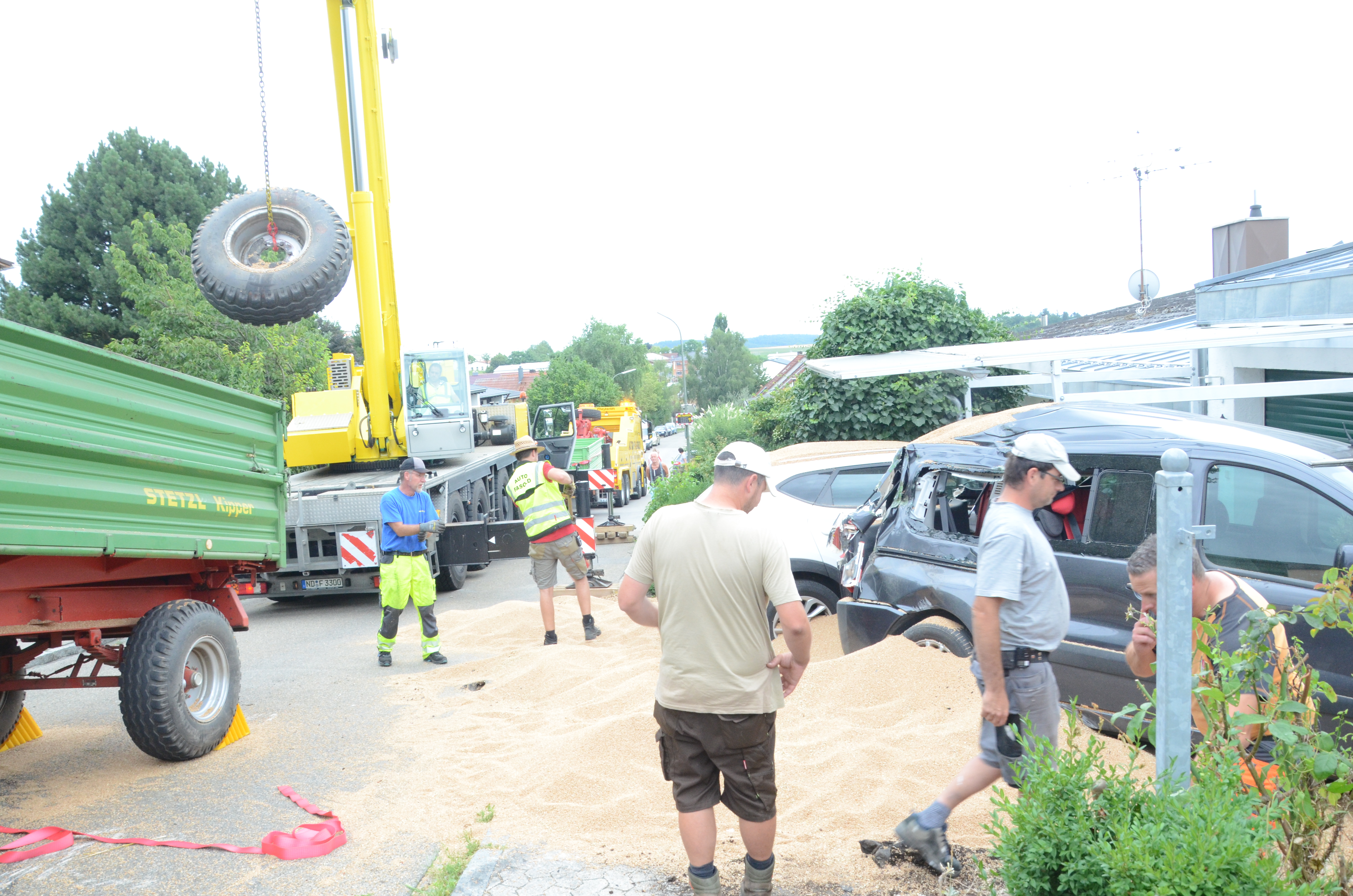 Die Maßnahmen gestalteten sich so aufwändig, da sich das Gespann massiv verkeilt hatte und weil aus dem ersten Anhänger mehrere Tonnen Getreide auf den "Südring", auf und an die beiden gerammten Pkw sowie auf das Privatgrundstück gerasselt waren. Die nachfolgende Foto-Serie dokumentiert die Situation nach dem Unfall sowie den Fortgang der Bergungs-Maßnahmen am gestrigen Nachmittag.