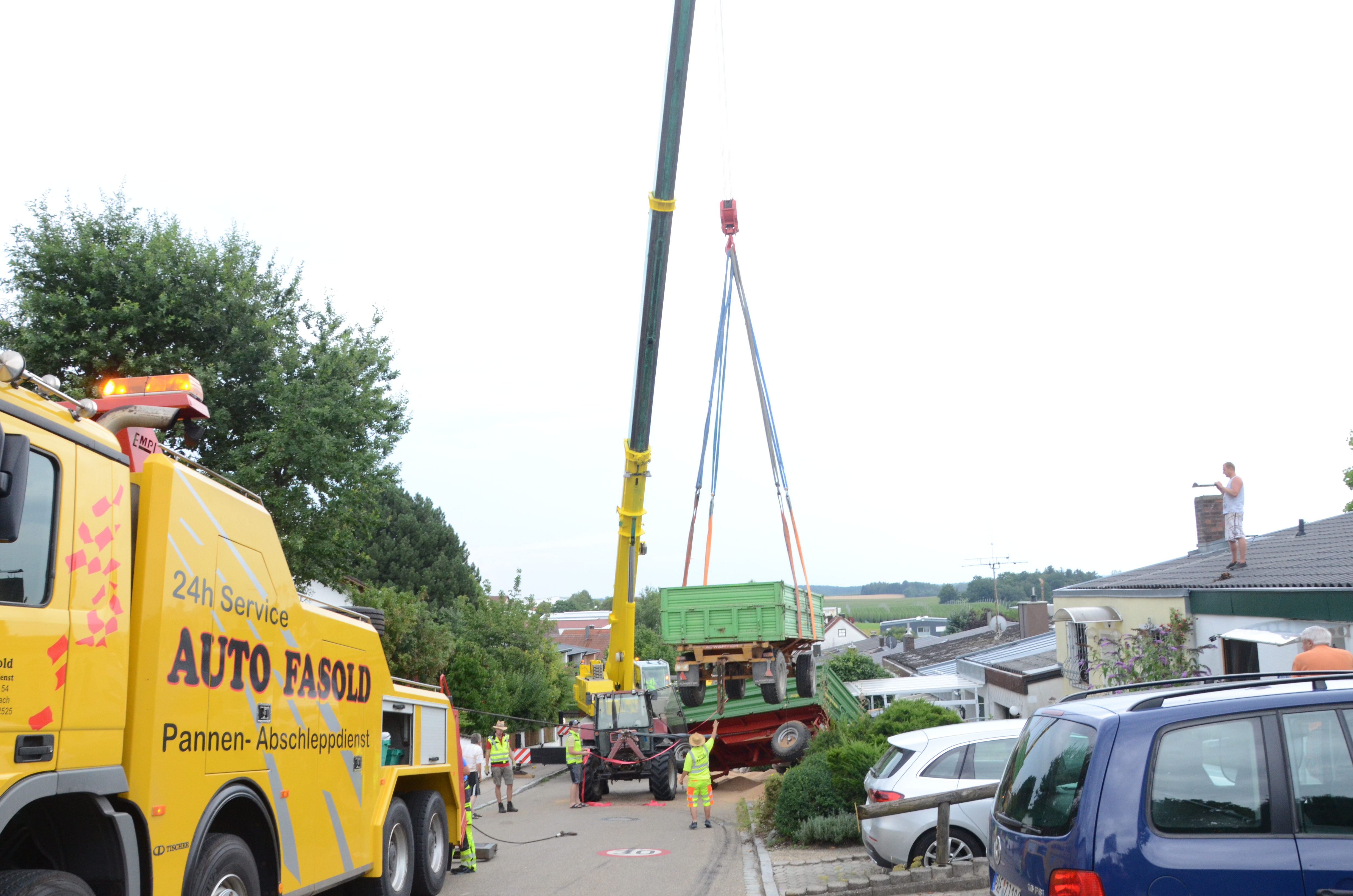 Den Schaden an diesen beiden gerammten Fahrzeugen bezifferte die Polizei heute in einer Größenordnung um 10 000 Euro. Ebenso hoch wird der Schaden an dem Traktor-Gespann angesiedelt. Die Bergungs-Arbeiten, in die neben der örtlichen Feuerwehr und dem Gemeinde-Bauhof auch ein Spezial-Unternehmen mit schwerem Gerät –unter anderem ein Kran – eingebunden waren, zogen sich bis etwa 17.30 Uhr hin.