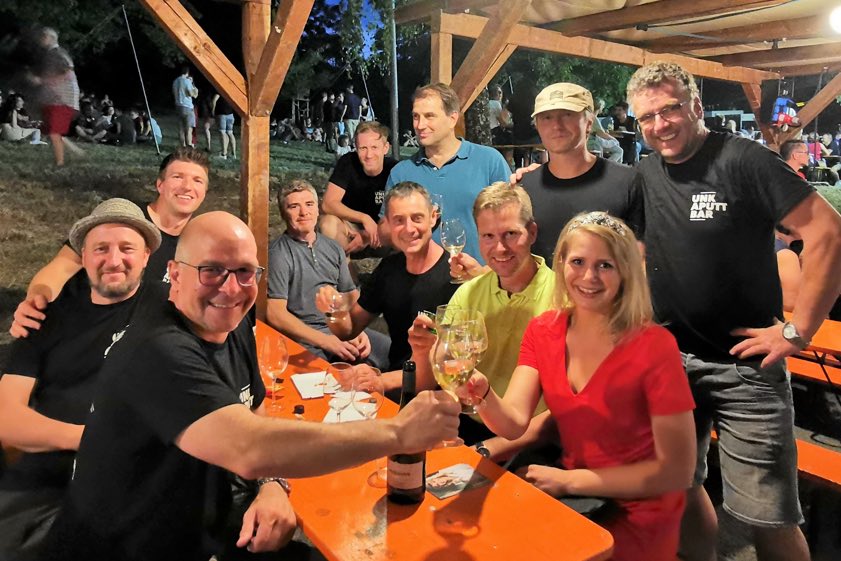 (ty) Die "Alte Herren"-Fußballer des Ball-Club Uttenhofen (BCU) zog es beim diesjährigen Sommer-Ausflug in die Heimat ihres Teamchefs Dominik Essig: Beim Besuch des Beilsteiner Weinbergfests gesellte sich sogar die Württemberger Weinkönigin Julia Böcklen an den Tisch der Kicker (Foto oben). Stark ersatzgeschwächt und wohl noch ein wenig "weinselig" mussten die BCU-Akteure allerdings am nächsten Vormittag beim Freundschaftsspiel gegen den TGV Eintracht Beilstein eine deutliche Schlappe einstecken.