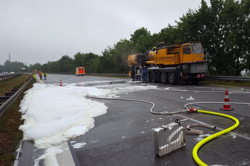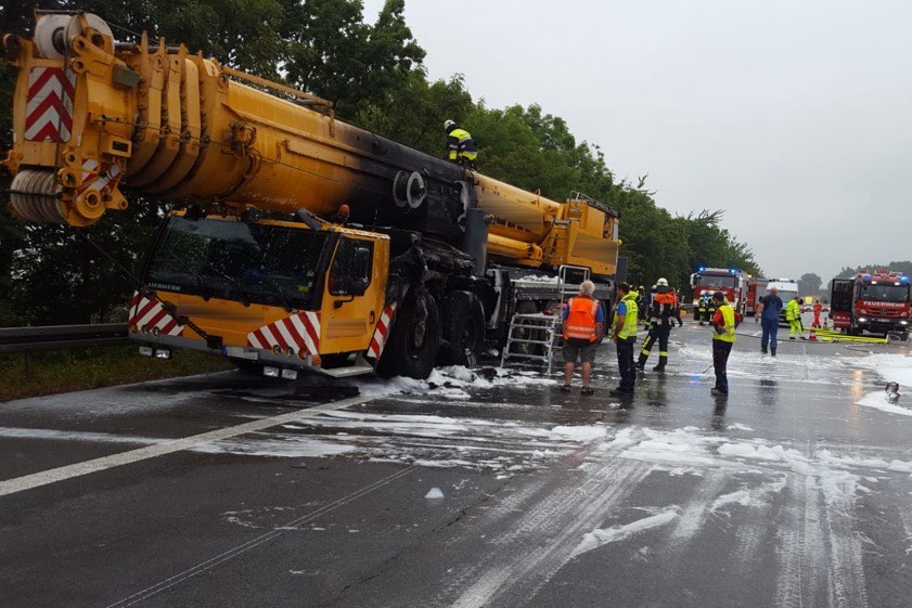 Inzwischen liegt ein aktuellerer Beitrag mit weiteren Informationen und Fotos vor: 72-Tonnen-Autokran brennt aus: A9 rund fünf Stunden lang gesperrt