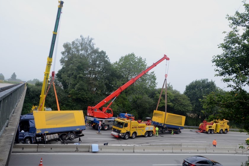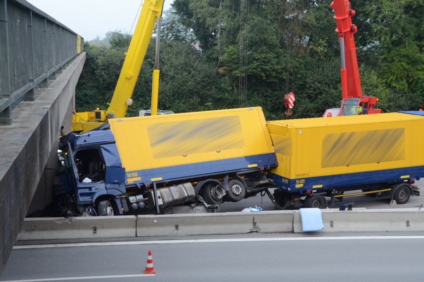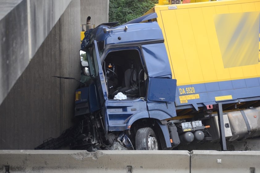 40-Tonner prallte heute Morgen in Fahrtrichtung München gegen einen Brückenpfeiler, der Fahrer wurde schwer verletzt.