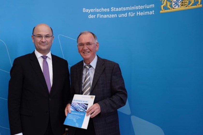 Minister Albert Füracker (links) übergab Vize-Landrat Anton Westner die Förderbescheide für den Ausbau der digitalen Infrastruktur. Foto: Bayerisches Staatsministerium der Finanzen und für Heimat