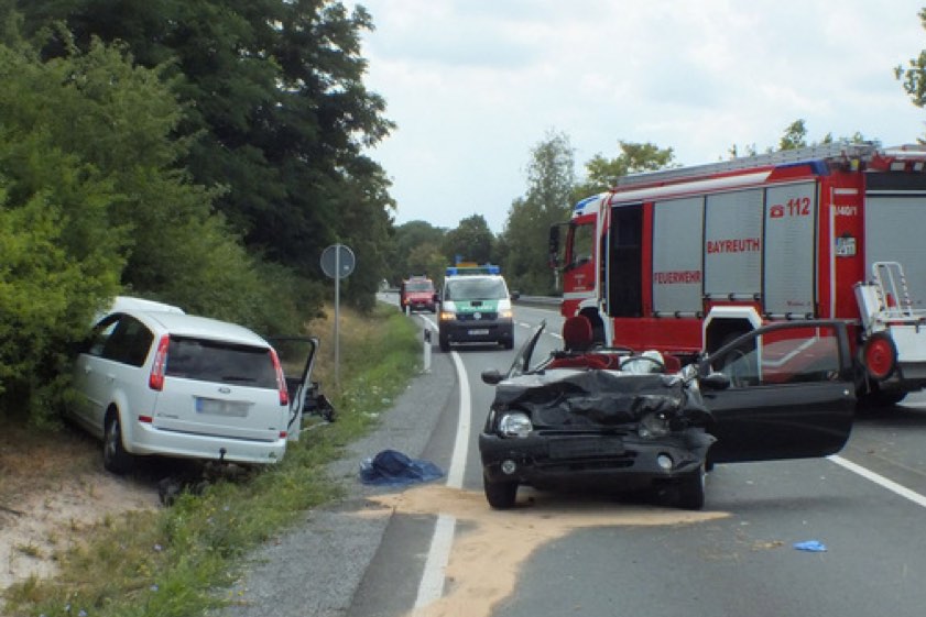 (ty) Drei Schwerverletzte hat gestern Mittag ein Verkehrsunfall auf der B2 in Bayreuth gefordert. Gegen 12.30 Uhr fuhr ein 61-Jähriger aus dem hiesigen Landkreis mit seinem Ford die Bundesstraße stadtauswärts, aus bislang ungeklärter Ursache kam sein Wagen auf Höhe des Briefzentrums nach links auf die Gegenfahrbahn und kollidierte dann offenbar ungebremst mit einem entgegenkommenden Renault (Foto ganz oben).