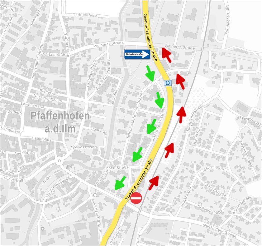 (ty) Nach der Beendigung der Baumaßnahmen an der Wasserleitung stehen jetzt die Asphalt-Arbeiten an: Aus diesem Grund muss in Pfaffenhofen die Joseph-Fraunhofer-Straße (= Bundesstraße B13) ab dem morgigen Mittwochabend, 19 Uhr, zwischen der Moosburger Straße und der Weiherer Straße noch einmal halbseitig für den Verkehr gesperrt werden. Das wurde heute von den Stadtwerken gemeldet. Die B13 wird damit in diesem Bereich erneut temporär zur Einbahnstraße.