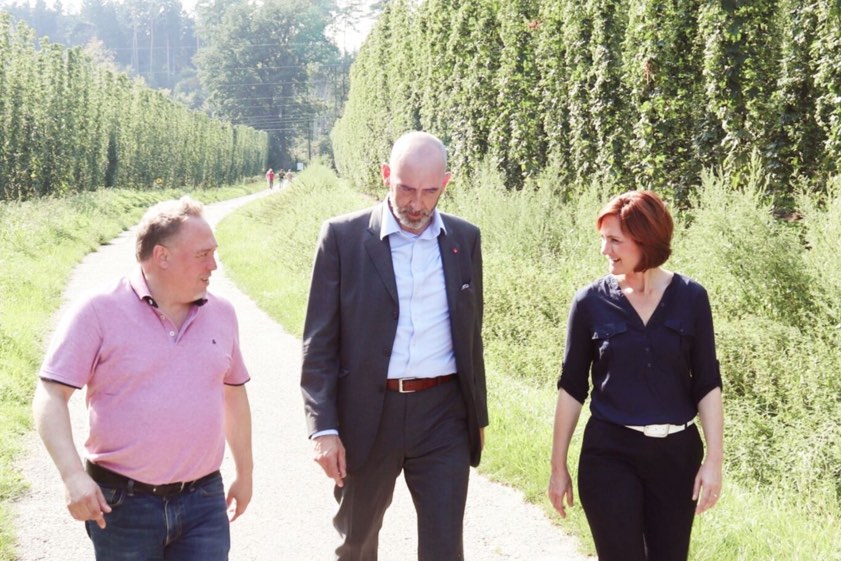 SPD-Kreischef Markus Käser (links) mit Alexander Ahrens und Simone Lange zwischen Hallertauer Hopfengärten bei Wolnzach. (Foto: Werner Hammerschmid)