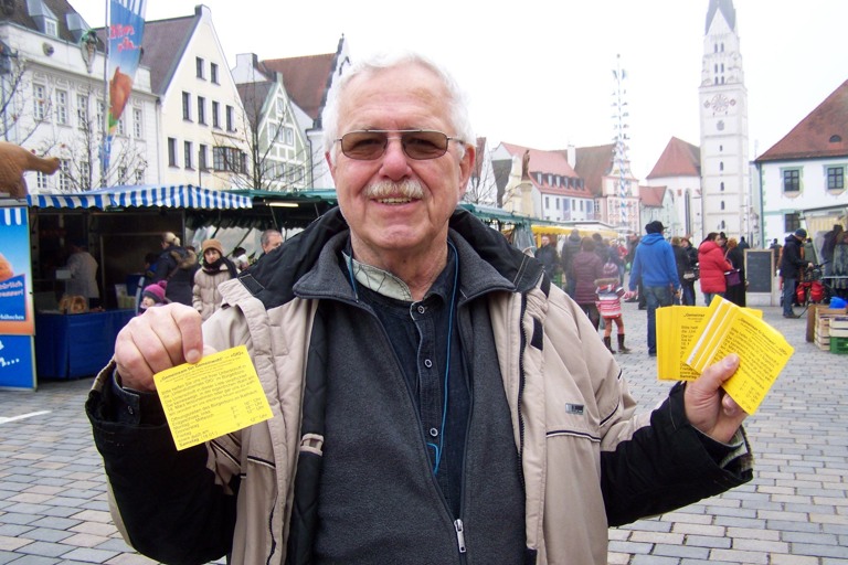 Ulrich Wandersleb-Münst verteilte am Samstag auf dem Wochenmarkt kleine Handzettel mit den Öffnungszeiten des Bürgerbüros, verbunden mit der Bitte um eine Unterstützer-Unterschrift für die Wählergruppe GfG.