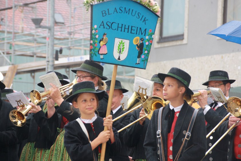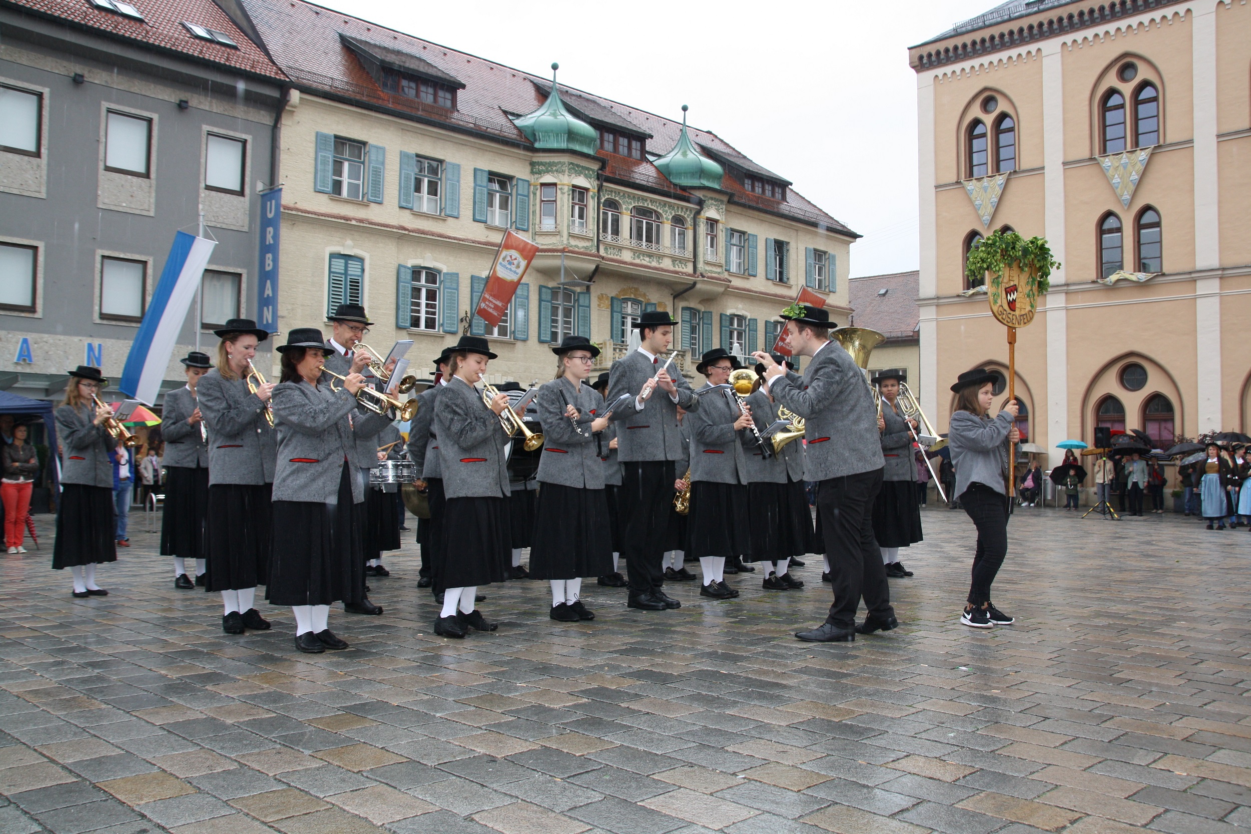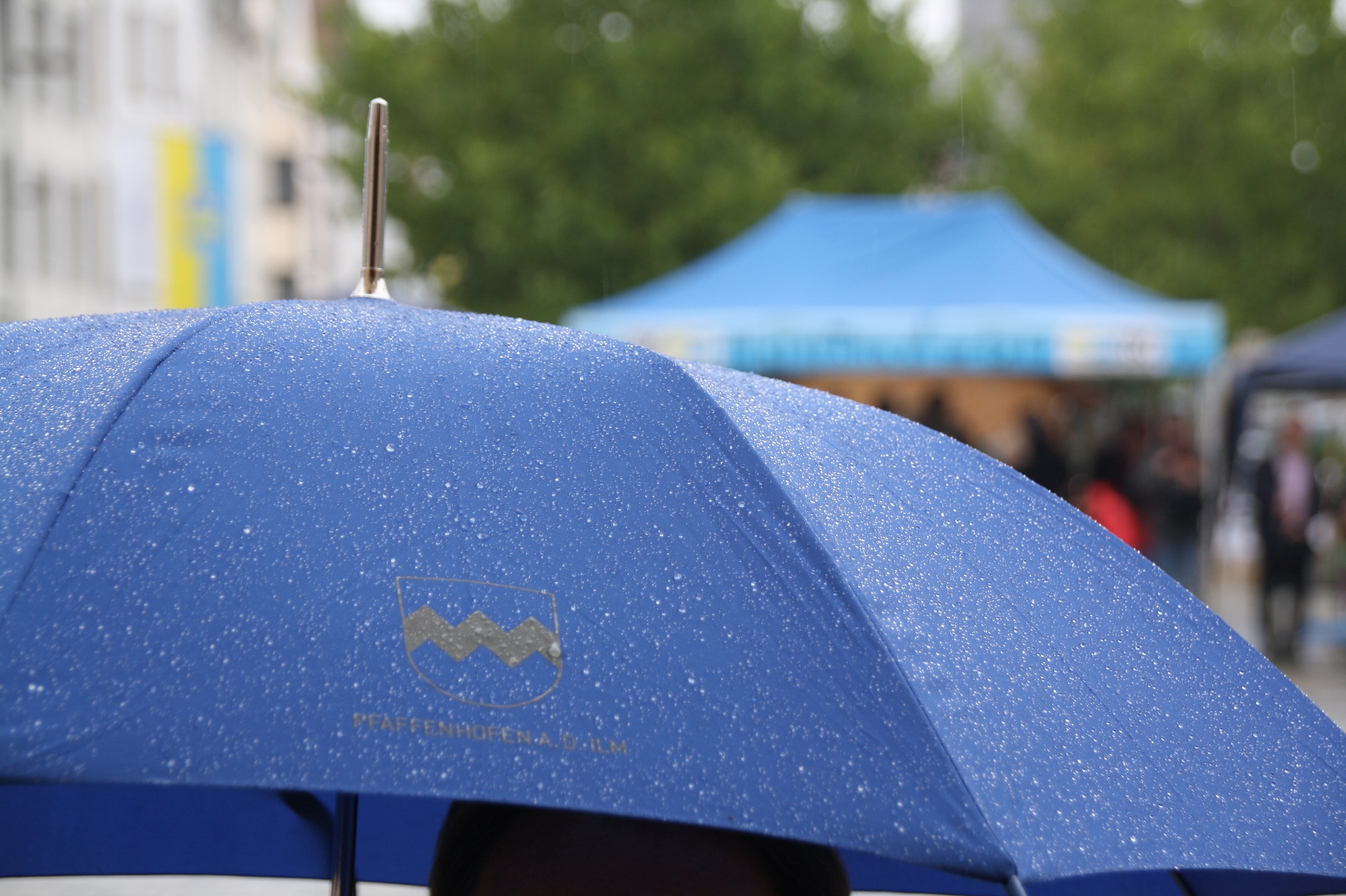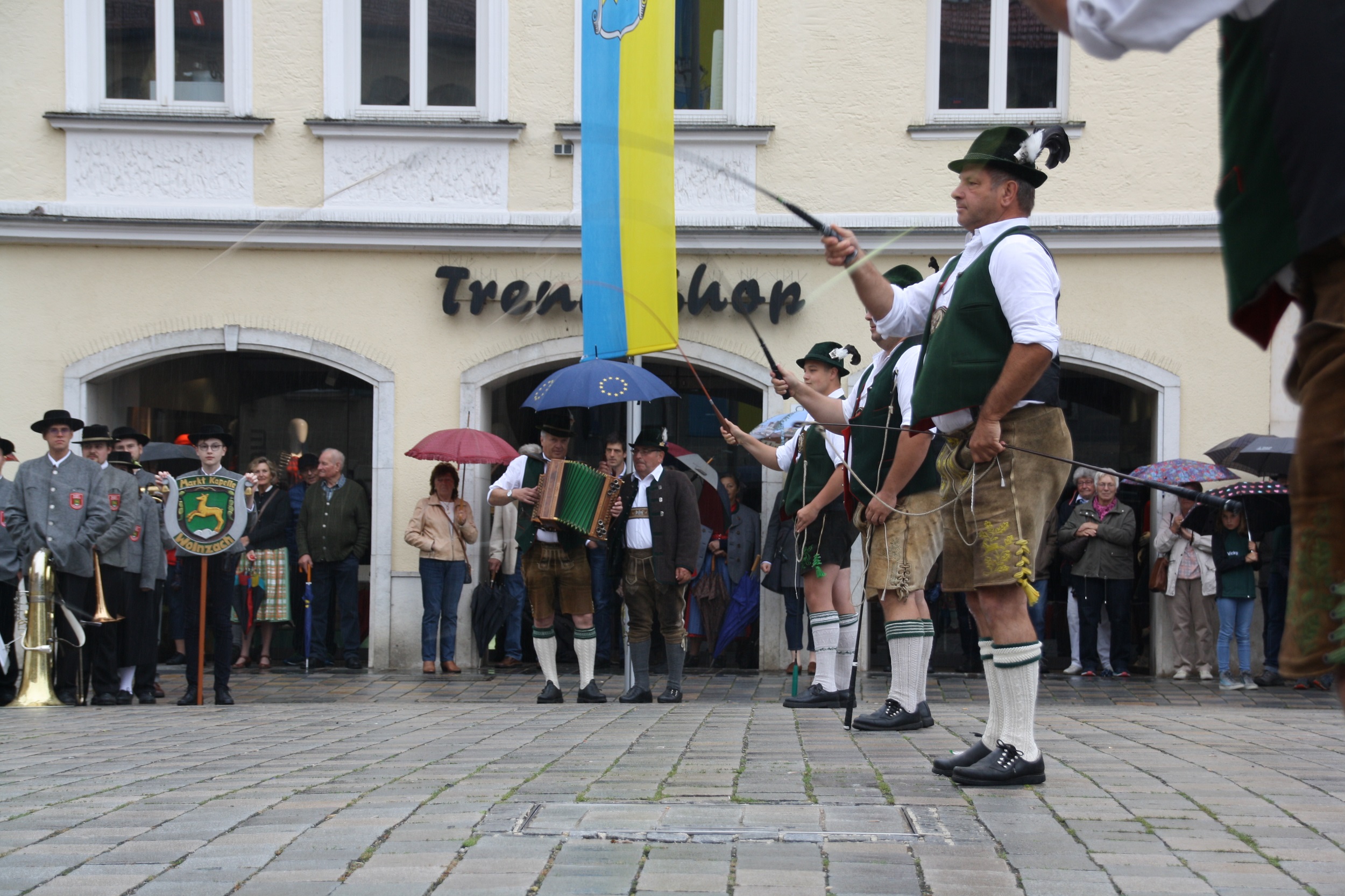 (ty) Sechs Blaskapellen und die hiesigen Goaßlschnoizer haben am gestrigen Nachmittag dem strömenden Regen getrotzt und sich zum traditionellen Volksfest-Standkonzert vor dem Pfaffenhofener Rathaus getroffen. Mehrere hundert Besucher suchten Schutz unter den eigens von der Stadtverwaltung aufgestellten Pavillons, unter Vordächern oder unter ihren Schirmen und harrten bis zum Schluss durch. Auch zahlreiche Stadträte sowie Bürgermeister Thomas Herker (SPD) ließen sich von dem unwirtlichen Wetter nicht abhalten.