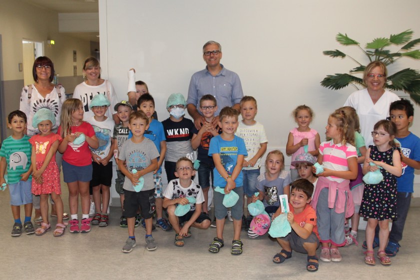 Gleich zu Beginn gab es ein Highlight: die Besichtigung eines Rettungswagens. In der Notaufnahme wurden einer Erzieherin und einem Kind der Unterarm eingegipst. Spannend war für die Buben und Mädchen auch, ihre eigenen Herztöne zu hören sowie selbst Blutdruck zu messen. Aufgeregt und etwas befangen ging es dann in Richtung Operationssaal. Freilich mussten sich die Kinder zuvor OP-Haube und Mundschutz anlegen. Aust zeigte ihnen die Geräte im OP. Einige Kinder trauten sich: Sie wurden an den Überwachungs-Monitor angeschlossen.