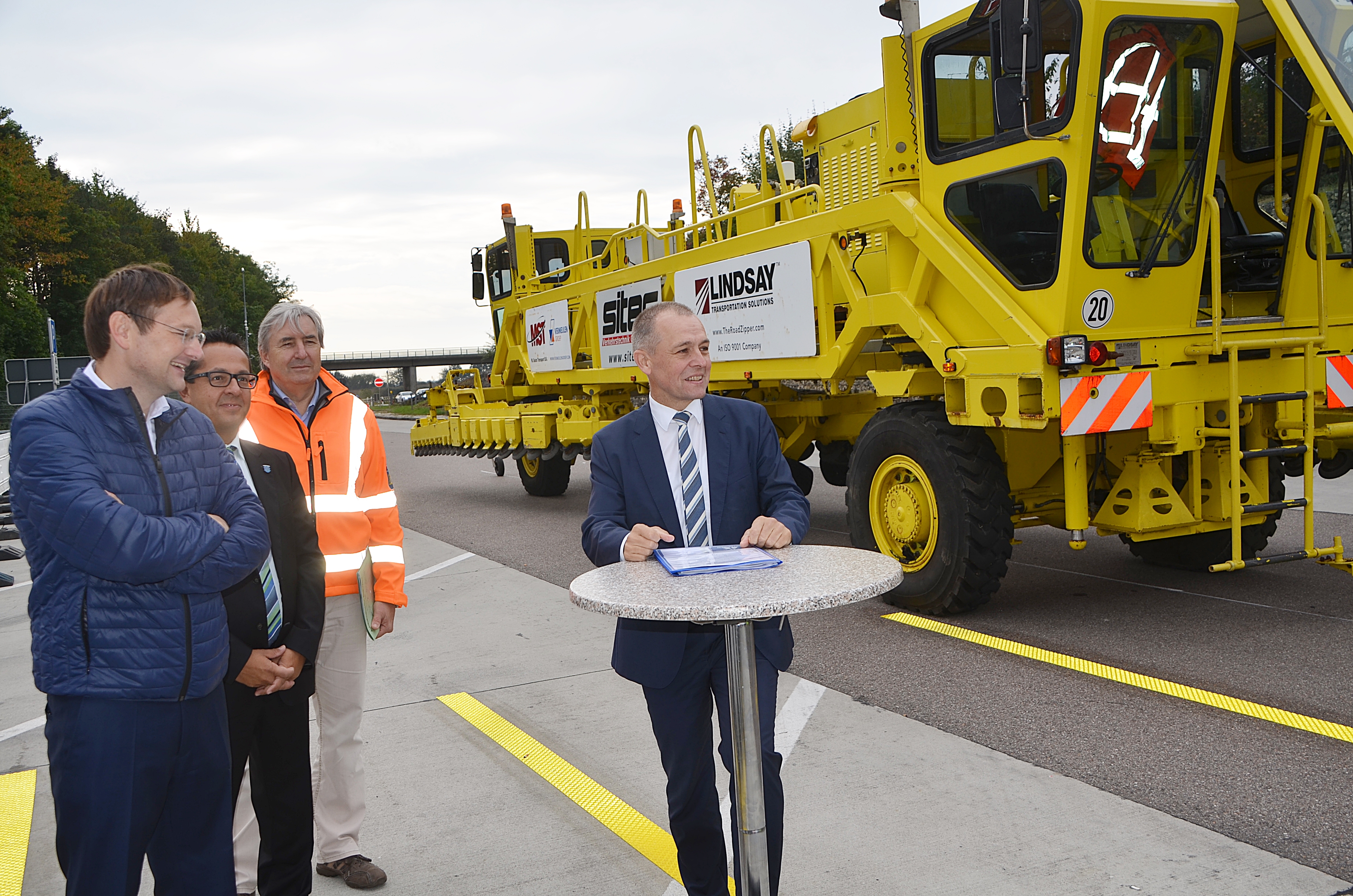 Bayerns Verkehrsminister Hans Reichhart (CSU), der sich heute persönlich auf dem Autobahn-Parkplatz Rohrbach-Ottersried ein Bild vom praktischen Betrieb der Road-Zipper-Maschine machte, unterstrich: "Das Super-System ist in den USA bereits im Normalbetrieb. Jetzt soll es auch in Deutschland eingesetzt werden." Bayern startet eben hier auf der A9 im Landkreis Pfaffenhofen einen Pilotversuch. Erste Ergebnisse der bevorstehenden Testphase erwartet sich der Minister nach Abschluss der Arbeiten, Ende des Jahres 2021.
