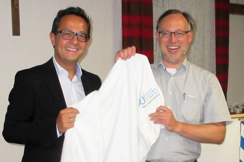 Franken bedankte sich bei Erdle für dessen kabarettistischen Auftritt mit einem weißen JWU-Handtuch. Er fügte augenzwinkernd hinzu, dieses könne bei Bedarf auch als weiße Fahne bei Angriffen aus dem Pfaffenhofener Landratsamt verwendet werden.