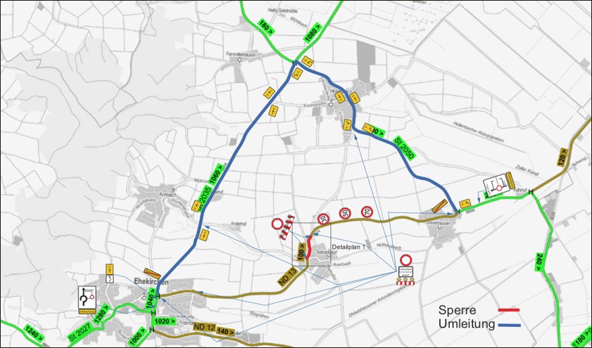 Die für den Durchgangsverkehr ausgeschilderte Umleitung erfolgt weiträumig über die Staatsstraße 2035 von Ehekirchen nach Hollenbach sowie die Staatsstraße 2050 von Hollenbach nach Dinkelshausen und umgekehrt. Die von der Baumaßnahme betroffenen Anwohner werden direkt durch das beauftragte Bauunternehmen über die Zufahrts-Möglichkeiten informiert. "Die Sperrung erfolgt voraussichtlich bis zum 20. Dezember", teilte das Landratsamt Neuburg-Schrobenhausen mit.
