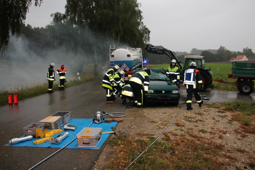 Die angenommene Lage stellte sich wie folgt dar: Ein Tanklastzug fuhr, in Richtung Stöffel unterwegs, auf ein stehendes Auto auf. Der Pkw wurde dadurch gegen einen Traktor mitsamt Anhänger geschleudert, der gerade von einem Feldweg in die St.-Kastl-Straße abbiegen wollte. Der Hänger des Traktors war mit einem Diesel-Fass beladen. Dieser Behälter riss infolge des Aufpralls auf, wodurch Diesel in das anliegende Feld lief. Der Pkw-Fahrer wurde in seinem Wagen eingeklemmt. Damit aber noch längst nicht genug.