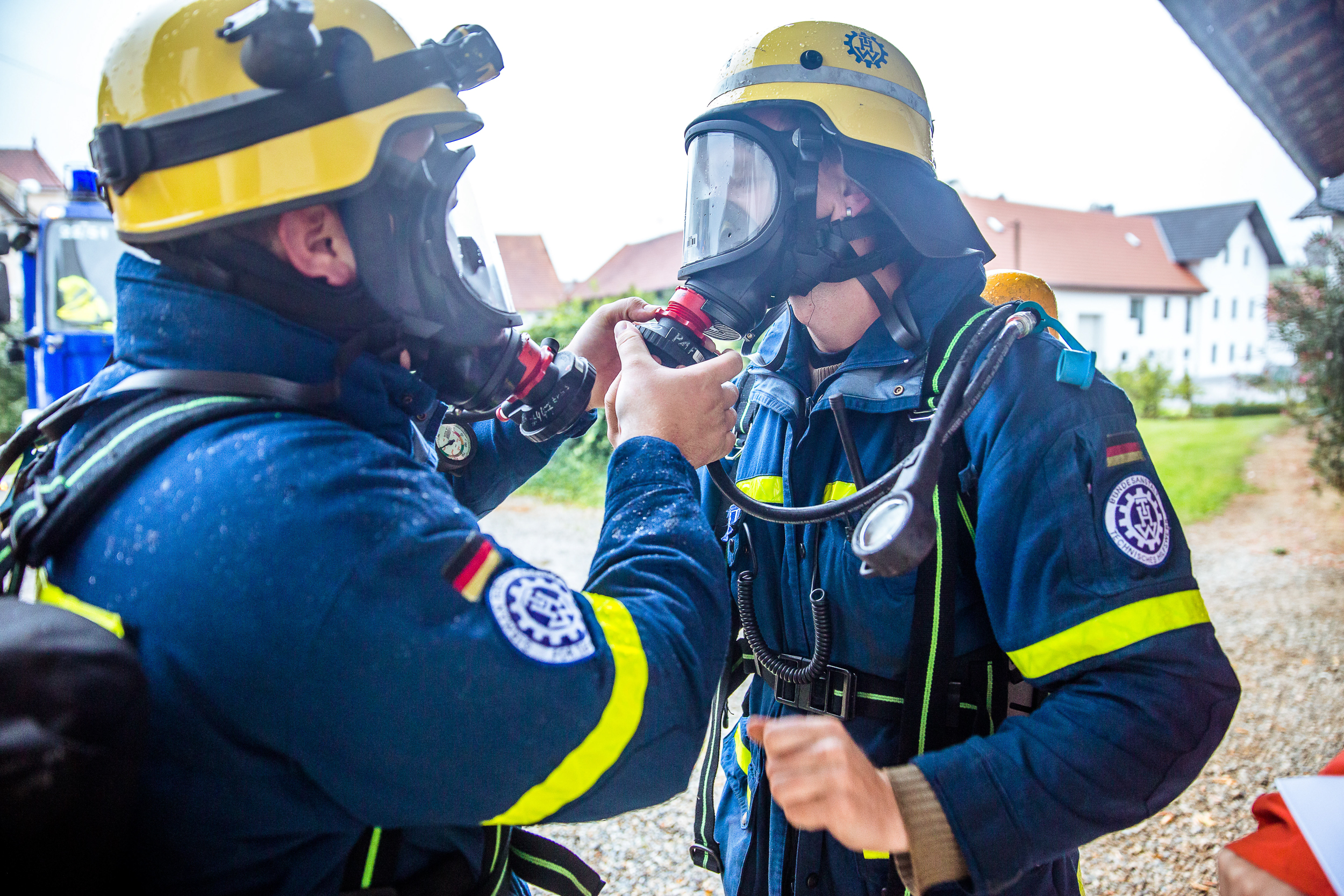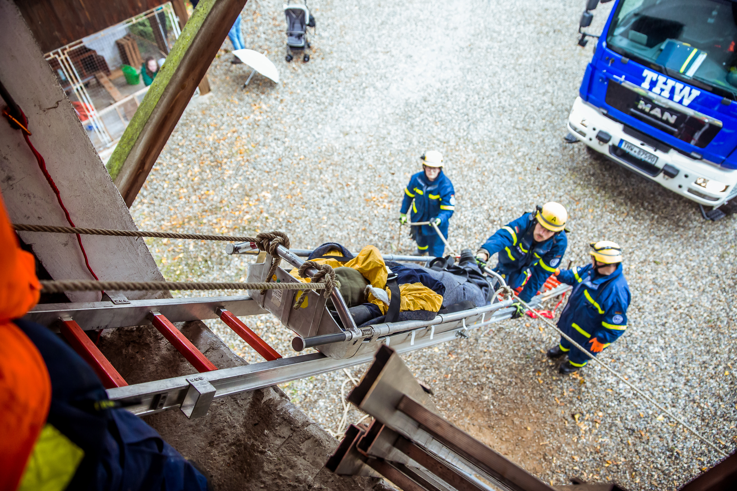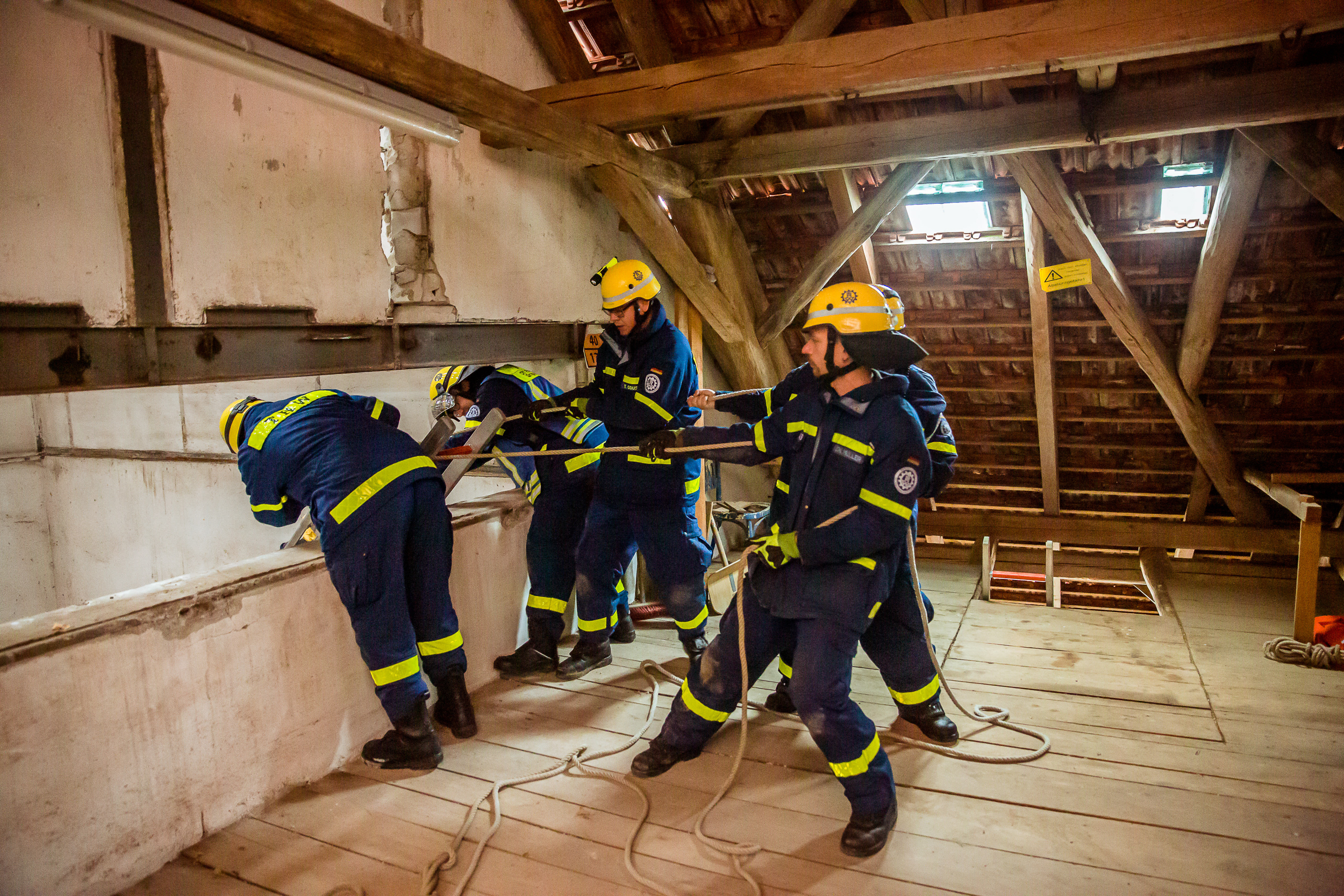 Parallel dazu war ein weiteres Team auf Anfahrt zu einem landwirtschaftlichen Anwesen in Rohr. Rauch stieg auf – eine unbekannte Substanz musste erst einmal geortet und analysiert werden. Hier galt es dann im Erstangriff unter Atemschutz schwer zu erreichende, verletzte Personen zu retten. "Leiterhebel" und "Schiefe Ebene", typische Rettungs-Methoden im Bergungs-Einsatz, fanden hier Verwendung.