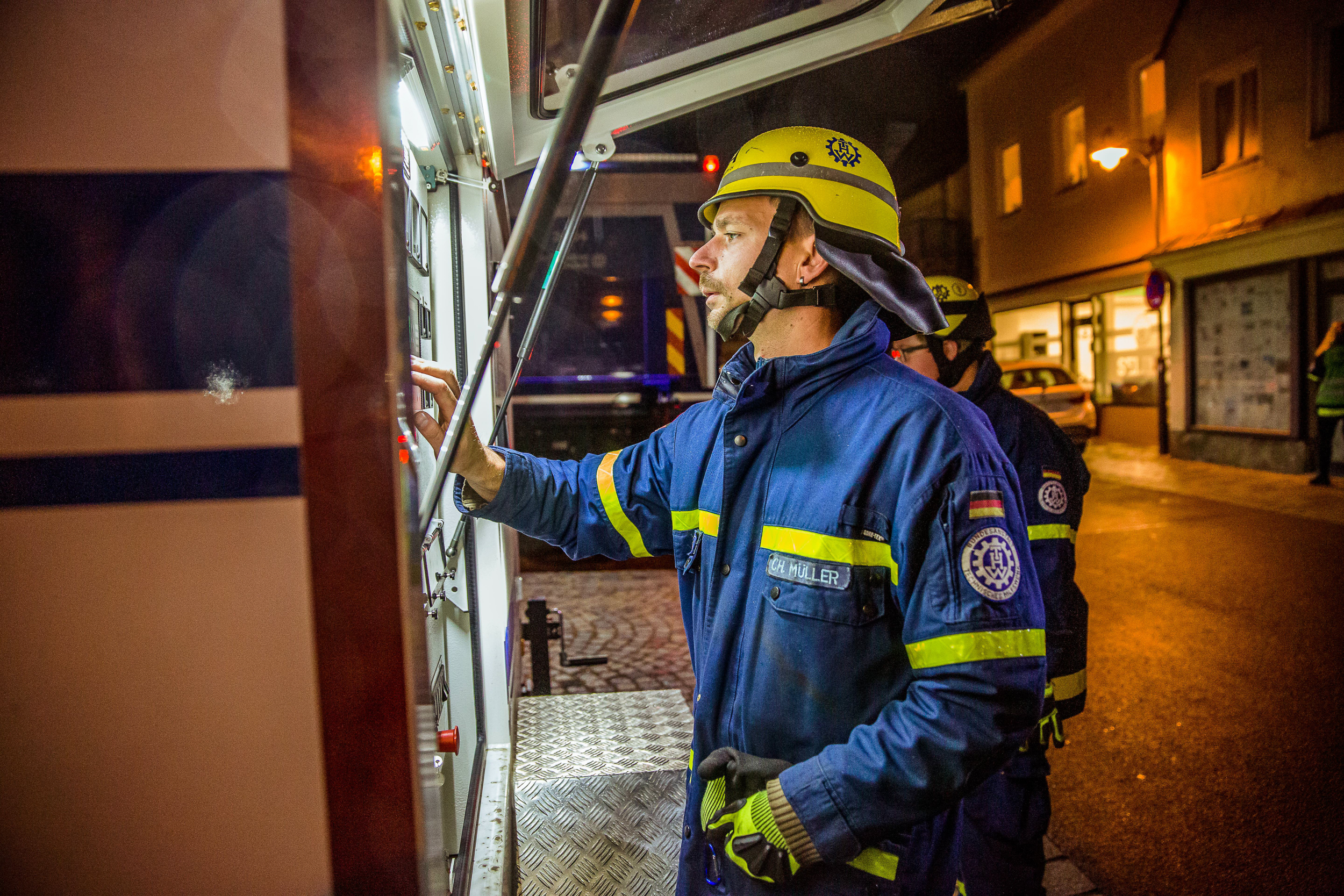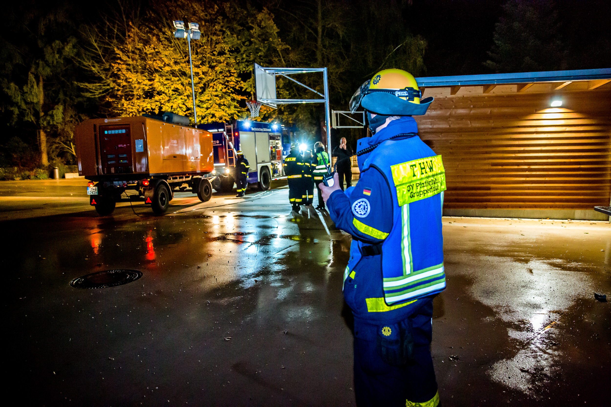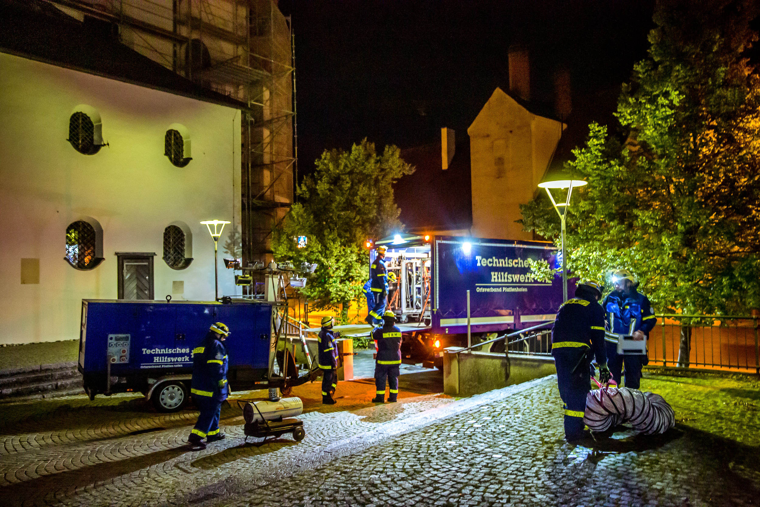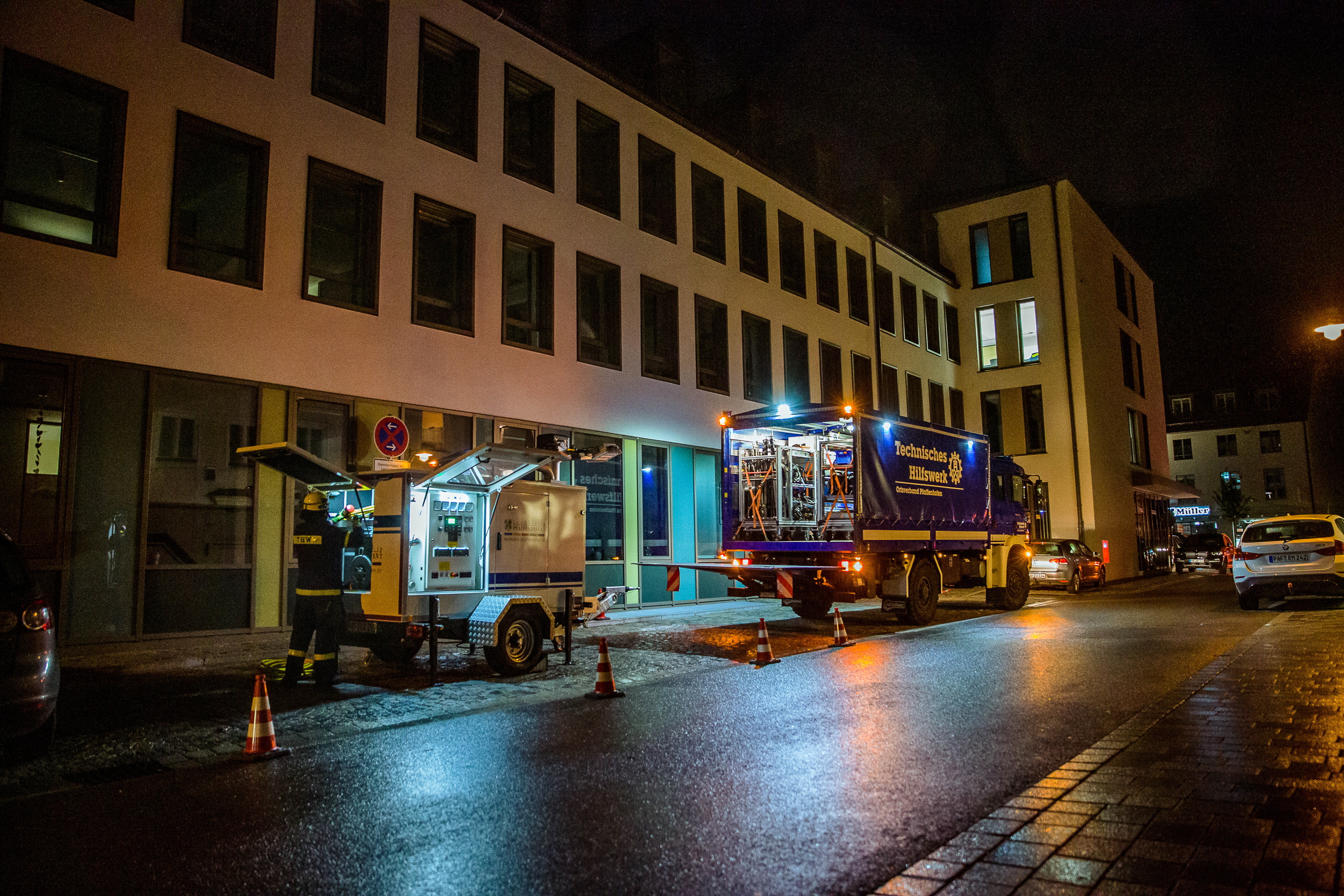 Es blieb aber nicht bei dieser einen Anforderung an das THW: Mehrere wichtige Gebäude in der Stadt Pfaffenhofen mussten mit großen Notstrom-Aggregaten betrieben werden – unter anderem, um eine beheizte und beleuchtete Anlaufstelle für Bürger einzurichten. Zu allem Stress kamen auch noch Übungs-Darsteller an die Einsatzstelle, um Helfer zusätzlich mit besonderen "Anliegen" zu fordern.