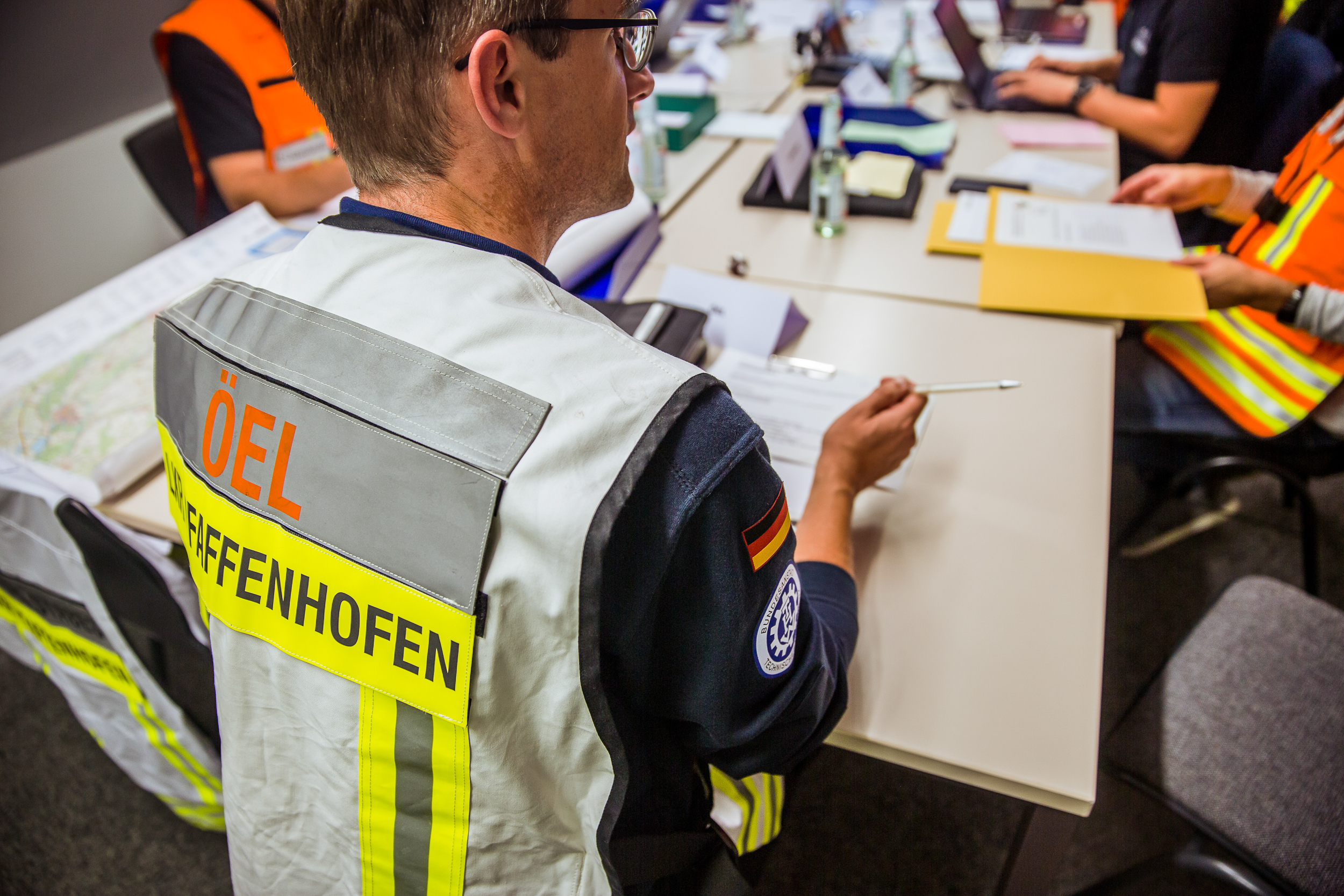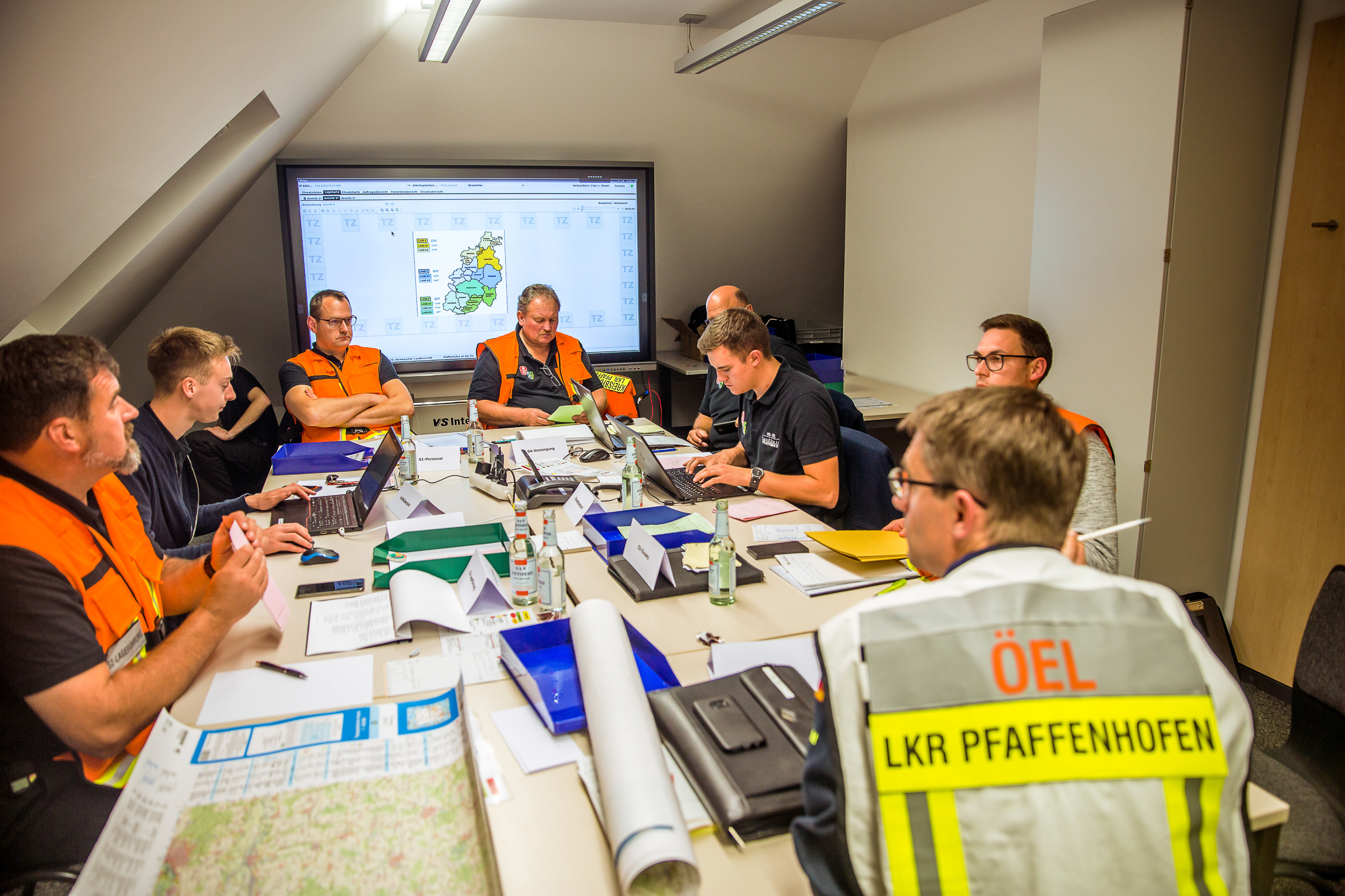 Während sich ein Teil der Mannschaft um den Betrieb der Infrastruktur und die Koordination im THW-Gebäude kümmerte, war bereits ein anderer Teil auf dem Weg zum Landratsamt in Pfaffenhofen: mit Notstrom-Aggregat und Geräte-Kraftwagen sollte die Notstrom-Versorgung des Krisenstabes in der Kreisbehörde sichergestellt werden. Das Landratsamt probte nämlich genau zum gleichen Zeitpunkt die Bewältigung dieses Szenarios als Stabsrahmenübung. Auch hier waren Einsatzkräfte des THW in unterschiedlichen Positionen eingebunden.