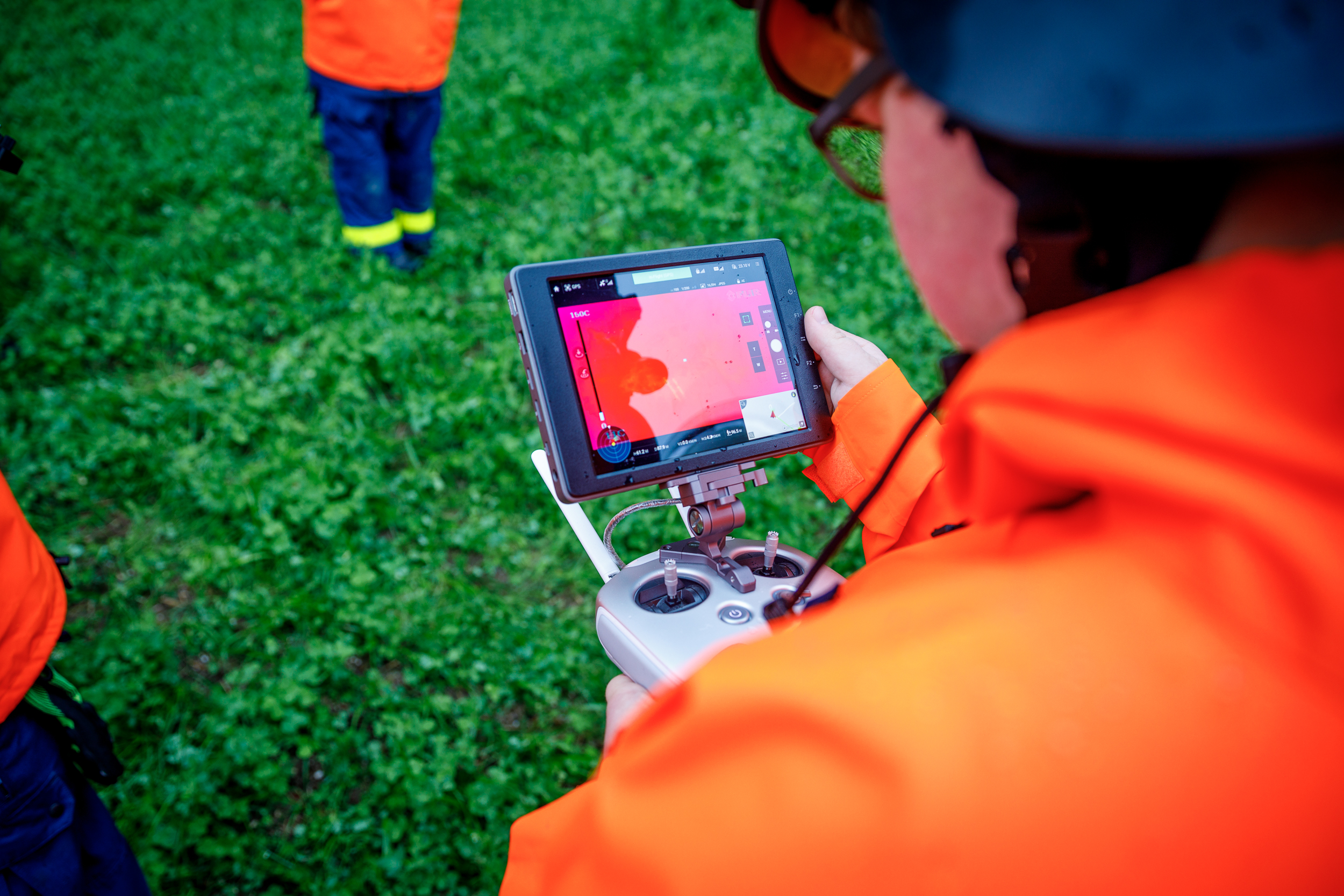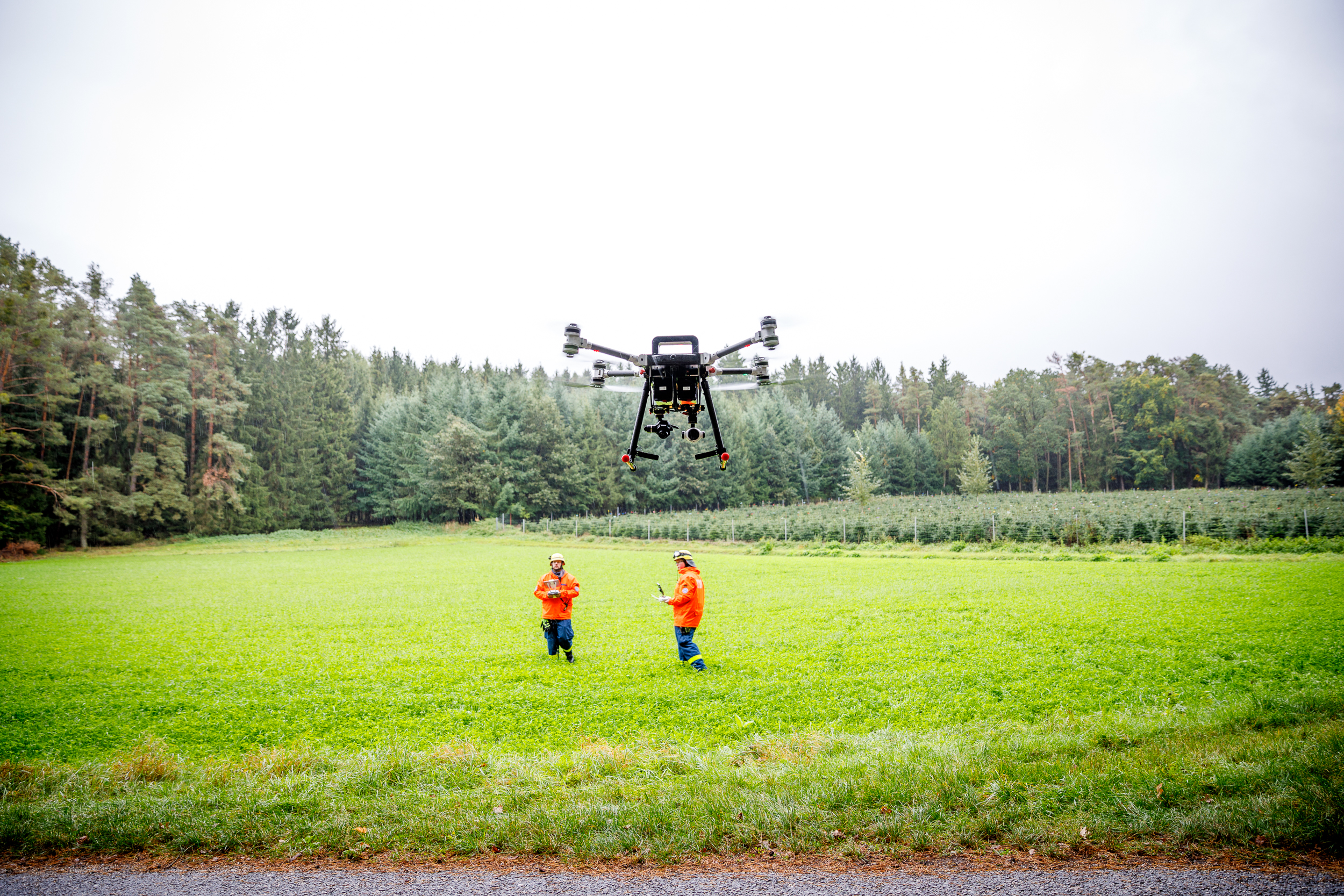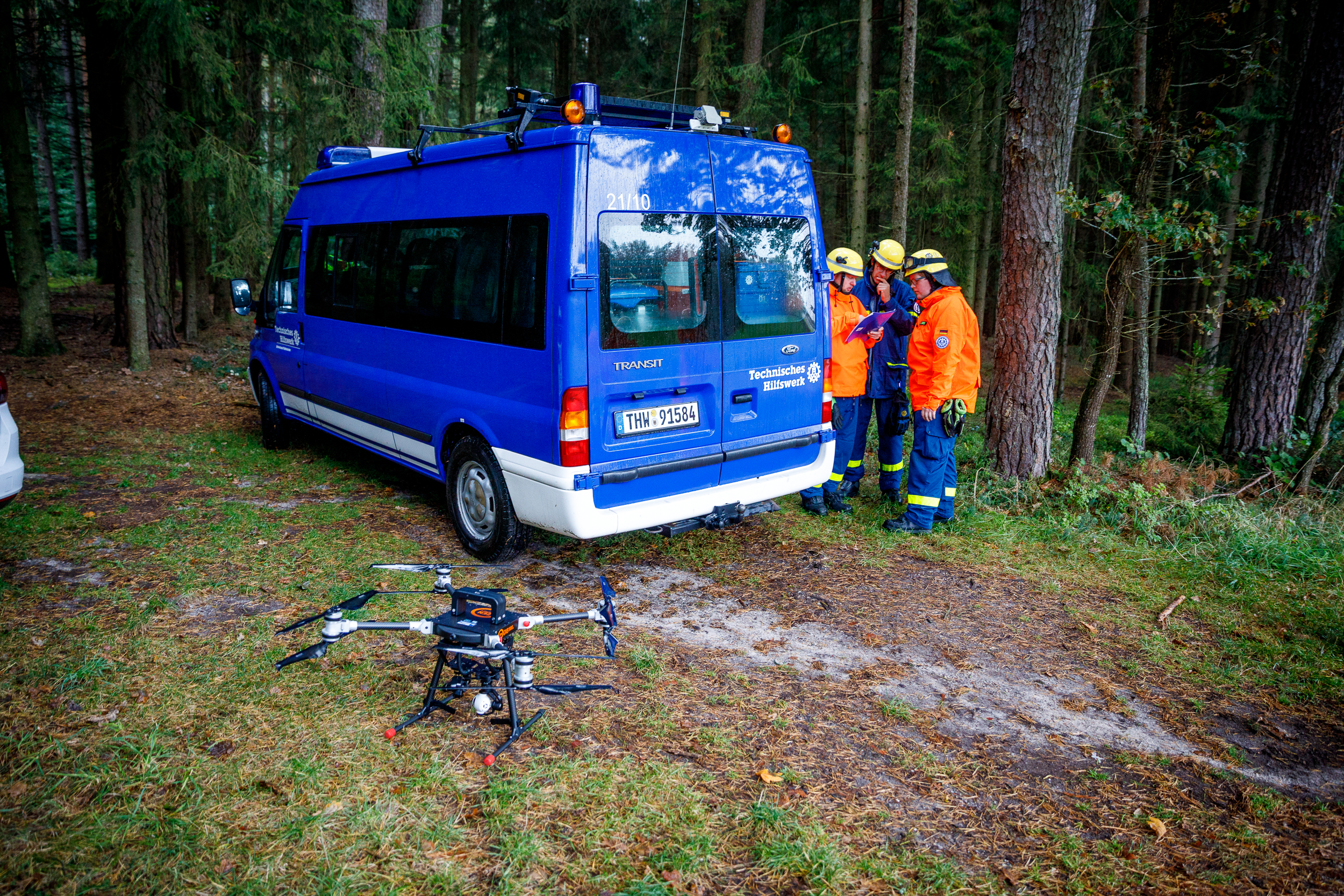 Nach einer kurzen Nacht ging es am frühen Morgen weiter: Mit Hilfe der Wärmebildkamera des Multicopter (Drohne) sollten erneut vermisste Personen aus der Luft in einem Wald geortet werden. Mit der bereits alarmierten BRK-Rettungshundestaffel aus Pfaffenhofen sollte das Zusammenspiel von biologischer und technischer Ortung erprobt werden. Die Darsteller wurden in verschiedenen Schwierigkeitsgraden in einem Waldstück nahe Rohr versteckt.