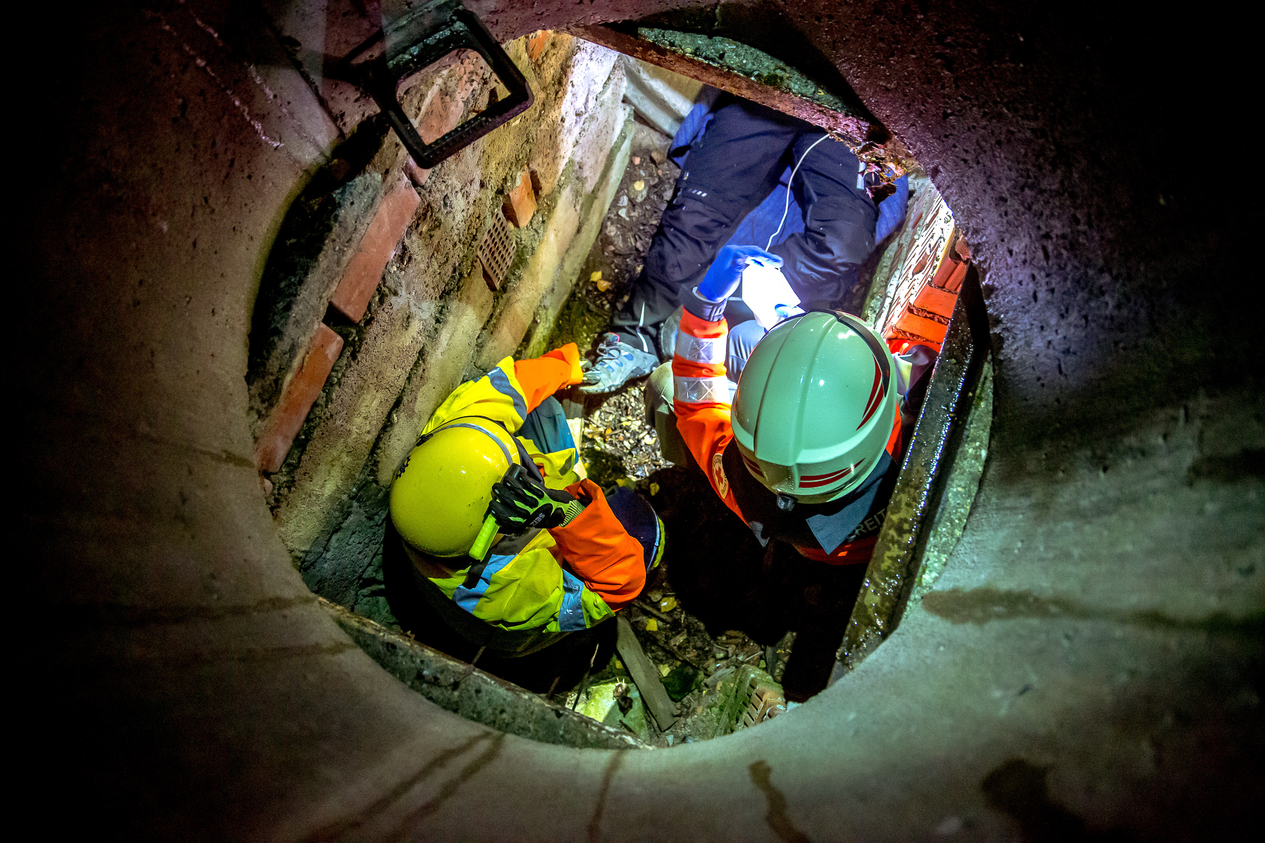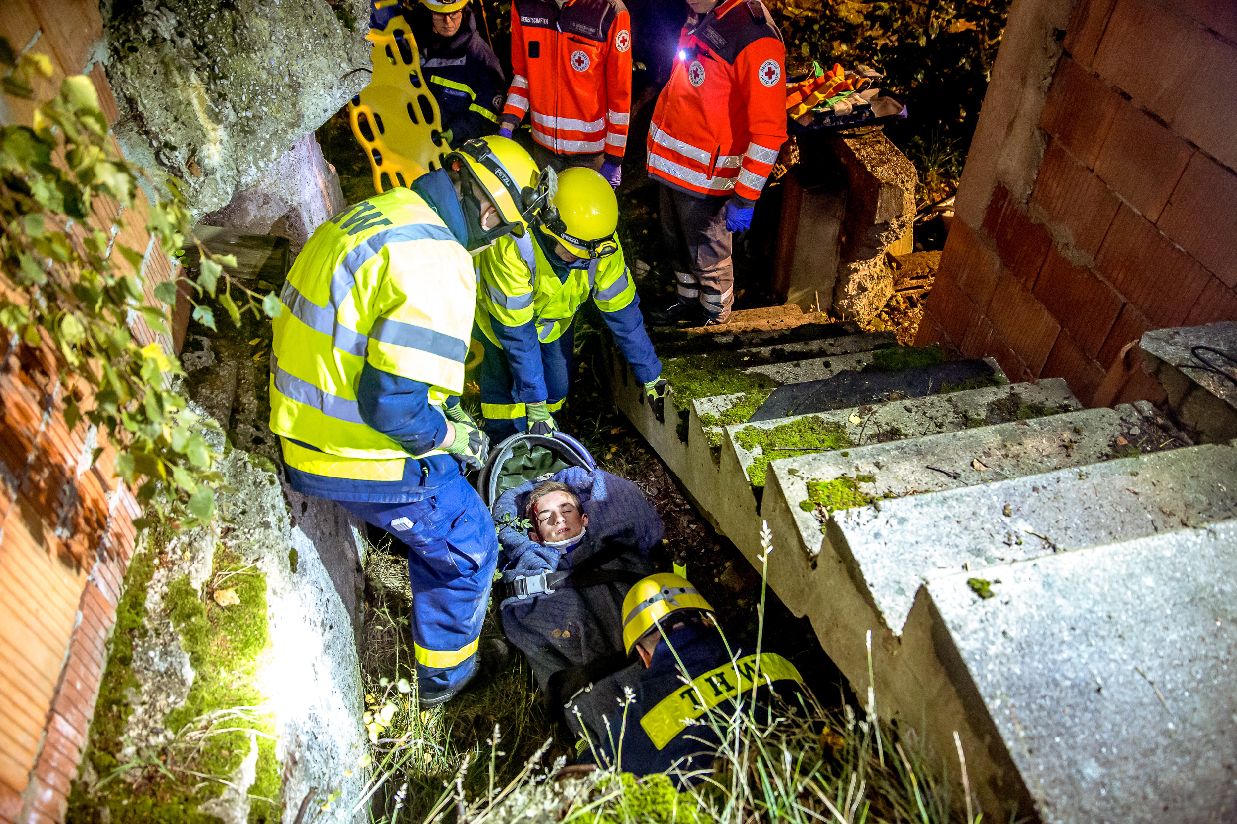 Die letzte Aufgabe vor der Nachtruhe: Mehrere Jugendliche wurden nach einem Verkehrsunfall auf einem weitläufigen Gelände nahe Schweitenkirchen vermisst. Nach einer ersten Erkundung mussten die vier Verschwundenen dann mit ganz unterschiedlichen Methoden gerettet werden. In Kooperation mit dem angeforderten BRK-Rettungsdienst wurden sie unter anderem aus einem etwa drei Meter tiefen Schacht und aus einem von der Straße abgekommenen Fahrzeug befreit. Das nasskalte Herbstwetter forderte die Helfer zusätzlich.