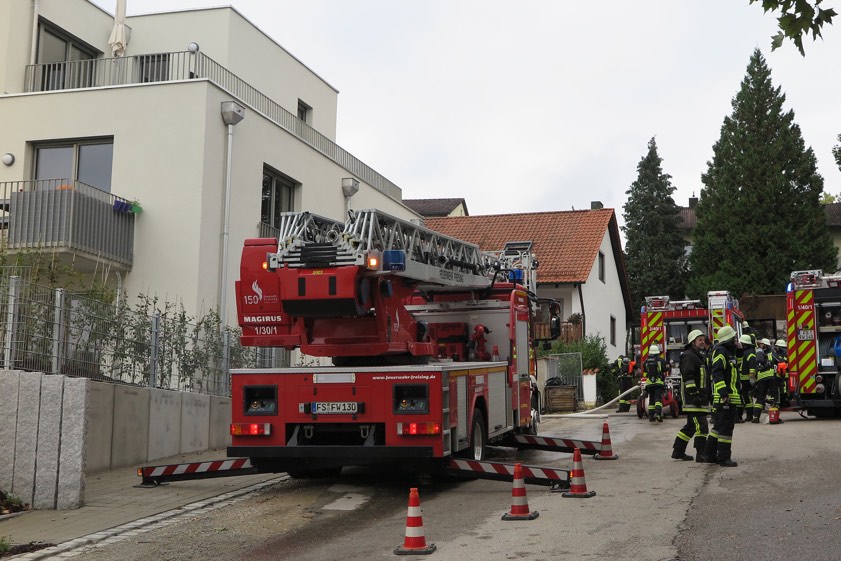 Um 16.29 Uhr wurde die Freisinger Hauptfeuerwache von der Integrierten Leitstelle alarmiert. Noch während der Anfahrt des Löschzuges sei die Alarmstufe erhöht worden, da Personen vom Feuer eingeschlossen gewesen seien. Weitere Einheiten von der Feuerwache 2, aus Attaching und Pulling rückten deshalb aus. Als etwa sieben Minuten später die ersten Feuerwehrleute eintrafen, wurde – so berichtet die Freisinger Wehr – umgehend die Drehleiter in Stellung gebracht, um eine Mutter mit ihrem Kleinkind unverletzt von der Dachterrasse des zweigeschossigen Wohnhauses zu retten.