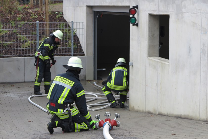 (ty) Großalarm herrschte am heutigen Nachmittag an der Mainburger Straße in Freising: Im Keller eines Mehrfamilienhauses war ein Brand ausgebrochen. Mehreren Personen war der Fluchtweg abgeschnitten. Die Feuerwehr brachte eine Mutter mit ihrem Kleinkind über die Drehleiter in Sicherheit. Ein Anwohner erlitt bei eigenen Löschversuchen eine Rauchgas-Vergiftung. Offenbar hatte Unrat, der unter einer Treppe gelagert war, aus noch ungeklärter Ursache Feuer gefangen.