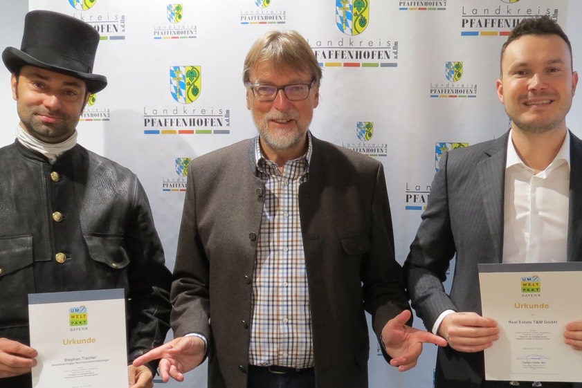(ty) Bezirks-Kaminkehrer-Meister Stephan Tischer aus Göbelsbach und die "Real Estate T&M GmbH" aus Geisenfeld nehmen am "Umweltpakt Bayern" teil. Der Pfaffenhofener Landrat Martin Wolf (CSU) überreichte kürzlich die entsprechenden Urkunden sowohl an Tischer selbst als auch an Matthias Dandl von der "Real Estate T&M GmbH" (Foto oben). Wolf dankte beiden Firmen für ihren Beitrag zum Erhalt der natürlichen Ressourcen. Nach Angaben der Kreisbehörde sind aktuell 80 Unternehmer aus dem Landkreis beim Umweltpakt. Jeder könne mit einsteigen.