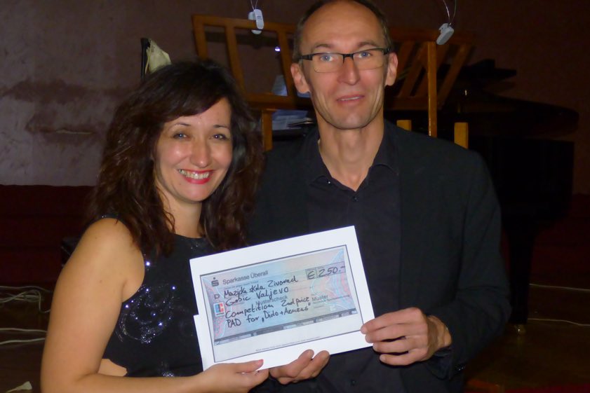 Die Zwillings-Schwestern Suzana Peric und Snezana Stevanovic spielten auf der Violine zusammen mit Milica Prodanovic am Klavier Stücke aus dem Programm der CD. Stefan Daubner vertrat das Schyren-Trio, deren Mitglieder Christiane Sauer und Marie-Therese Daubner nicht mitreisen konnten, am Klavier. Zusammen mit den serbischen Musikerinnen spielte Daubner am Kontrabass ein Medley aus dem aktuellen Musical "Tisa", das eigens für diese Besetzung arrangiert worden war. Am Ende der Veranstaltung übergab Daubner einen Scheck über 250 Euro an Musikschul-Leiterin Suzana Peric (Foto unten).
