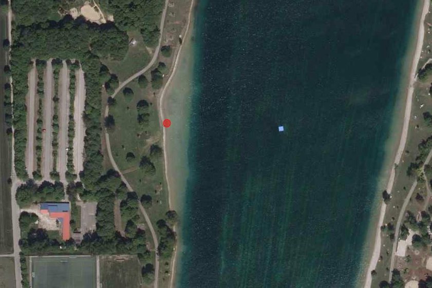 Zeugen, die in diesem Zusammenhang im genannten Zeitraum Personen oder Fahrzeuge beobachtet haben, werden darum gebeten, sich bei der Polizei zu melden. Hinweise nimmt die zuständige Kriminalpolizei in Fürstenfeldbruck unter der Telefonnummer (0 81 41) 61 20 oder jede andere Polizei-Dienststelle entgegen. Auf dem unten gezeigten Luftbild-Ausschnitt, der heute von der Kripo veröffentlicht wurde, ist der ungefähre Fundort der Gasflaschen am Ufer des Sees mit einem roten Punkt markiert.