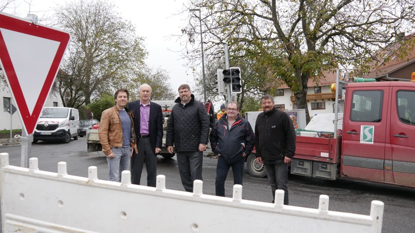 Auf dem Foto oben sind vor Ort: Christian Schweiger (von links, Schweiger-Straßenbau), Simon Landmann (Bürgermeister von Bergkirchen), Stefan Löwl (Landrat), Bernhard Fritz (Tiefbau-Abteilung am Landratsamt), Christian Lang (Tiefbau-Abteilung am Landratsamt). Foto: Lein, Landratsamt Dachau