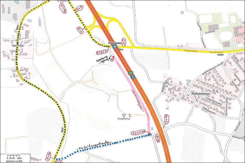 (ty) Die Entlastungsstraße an Autobahn A9 bei Schweitenkirchen muss ab sofort und bis Freitag, 13. Dezember, wegen der Erstellung von Bankett-Platten voll gesperrt bleiben. Das wurde heute aus dem Pfaffenhofener Landratsamt gemeldet. Die Umleitung erfolgt den Angaben zufolge über die Staatsstraße 2045 in Richtung Oberthann, links in die Kreisstraße PAF 27, vor Niederthann links auf die Verbindungsstraße in Richtung Schweitenkirchen sowie umgekehrt. Auf der Übersichts-Karte oben ist der komplett gesperrte Abschnitt neben der Autobahn (orange) in hellroter Farbe markiert. Die blauen Punkte zeigen die Umleitung.