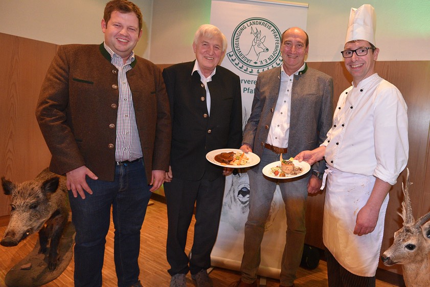 Zu dem Vier-Gänge-Menü aus den Händen von Küchenchef Christian Reichart begrüßte Braun allen voran den Ehrenvorsitzenden der hiesigen Jägervereinigung, Altlandrat Rudi Engelhard (CSU). Darüber hinaus galten seine Willkommens-Worte auch zahlreichen weiteren Gästen und nicht zuletzt der Jagdhornbläser-Gruppe des Vereins. Die Auftritte des Ensembles verliehen der Veranstaltung mit verschiedenen Jagdsignalen und Jägermärschen einen feierlichen musikalischen Rahmen.