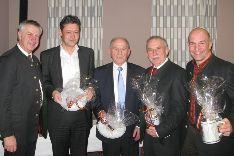 Geschenke an Funktionärsspitze und Gastgeber: Schirmherr Reinhard Heinrich (von links) bedankt sich bei Bezirksschiedsrichterobmann Robert Schraudner, Ehren-Bezirksschiedsrichterobmann Max Klauser, Gruppenschiedsrichterobmann Albert Schnell und Moderator Wolfgang Inderwies.