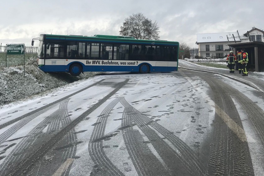 Wegen Glätte kam am Nachmittag ein unbesetzter Linienbus auf der Kreisstraße FS38 zwischen Rudelzhausen und Tegernbach im Ausgang einer abschüssigen Rechtskurve ins Schleudern und prallte gegen die rechte Böschung (Foto oben). Mit Hilfe eines Krans wurde der Bus geborgen. Die Kreisstraße war für mehrere Stunden gesperrt. Die Feuerwehren aus Au in der Hallertau, Enzelhausen und Tegernbach waren mit 25 Mann vor Ort. Die Bus-Fahrerin wurde leicht verletzt, sie kam vorsorglich ins Krankenhaus nach Mainburg. Am Bus entstand ein geschätzter Schaden in Höhe von 5000 Euro.