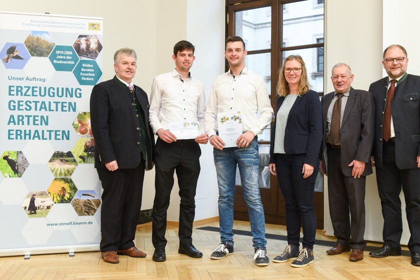 (ty) Als Anerkennung für ihr herausragendes Projekt beim landesweiten Wettbewerb "Biodiversität – Erzeugung gestalten, Arten erhalten" wurde das Drittsemester der Dr.-Eisenmann-Landwirtschaftsschule Pfaffenhofen von der bayerischen Landwirtschafts-Ministerin Michaela Kaniber (CSU) ausgezeichnet. Aus der Hand von Amtschef Hubert Bittlmayer bekamen die Studierenden Josef Moll und Johannes Bemmerl stellvertretend für das ganze Semester den mit 900 Euro dotierten Silberpreis für ihre Leistungen.
