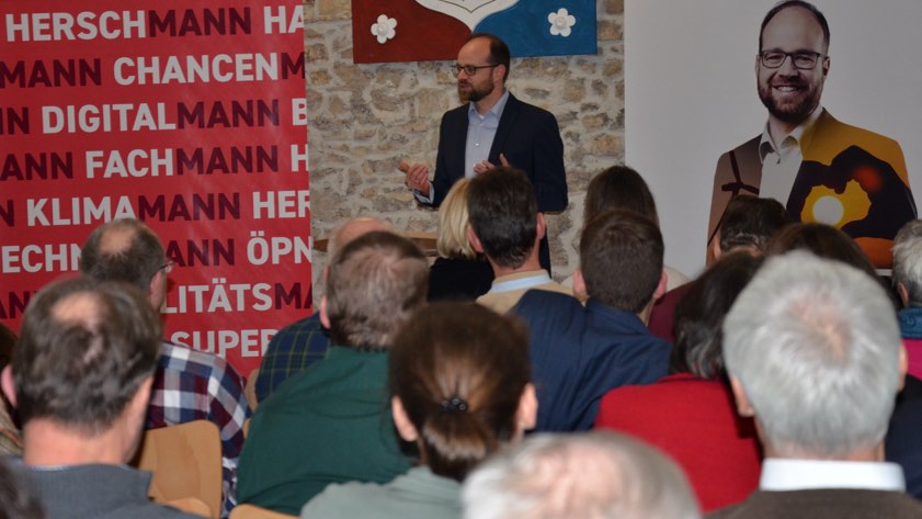 Im Falle seiner Wahl zum Landrat wolle er Themen-Allianzen über Parteigrenzen hinweg bilden, um gemeinsam mit den 19 Gemeinden im Kreis Pfaffenhofen die Themen der Zukunft voranzubringen. Weitere sechs Jahre Stillstand würden seiner Ansicht nach praktisch zehn Jahre Stillstand bedeuten – denn es würde danach Jahre dauern, bis wieder etwas passiere, sagte er sinngemäß. Die CSU versuche, den Wohlstand zu verwalten, vergesse dabei aber manches. Herschmann verwies darauf, dass der Landkreis bei vielem Schlusslicht sei, und signalisierte, das ändern zu wollen: "Von der roten Laterne zum roten Leuchtturm."