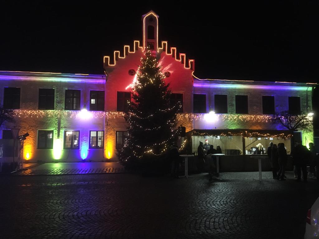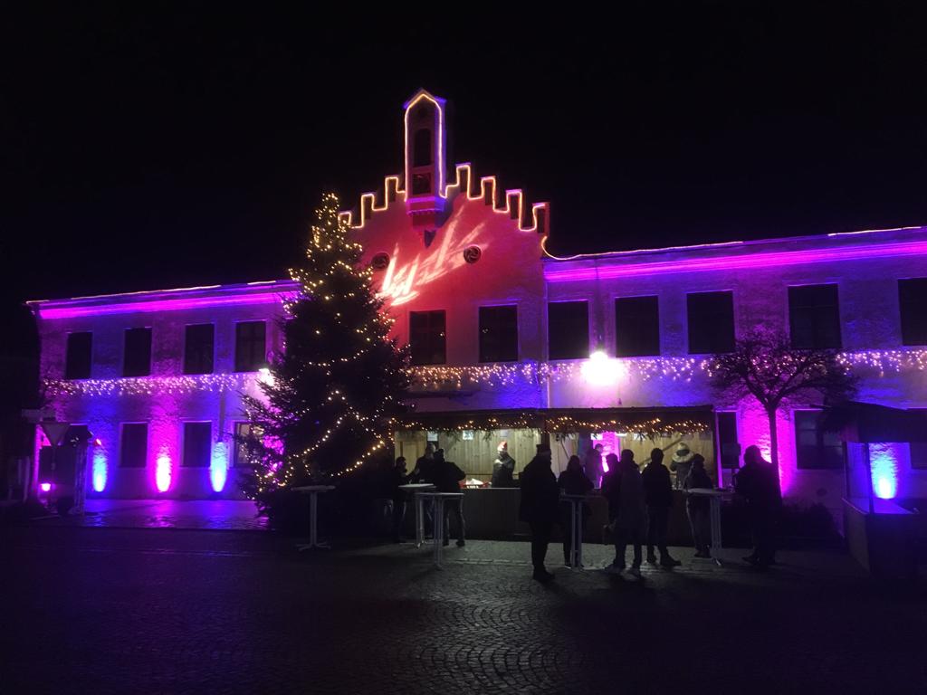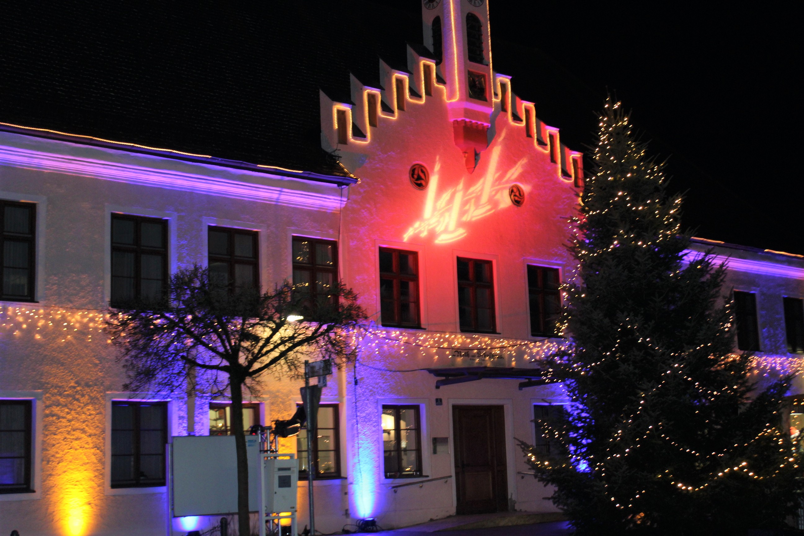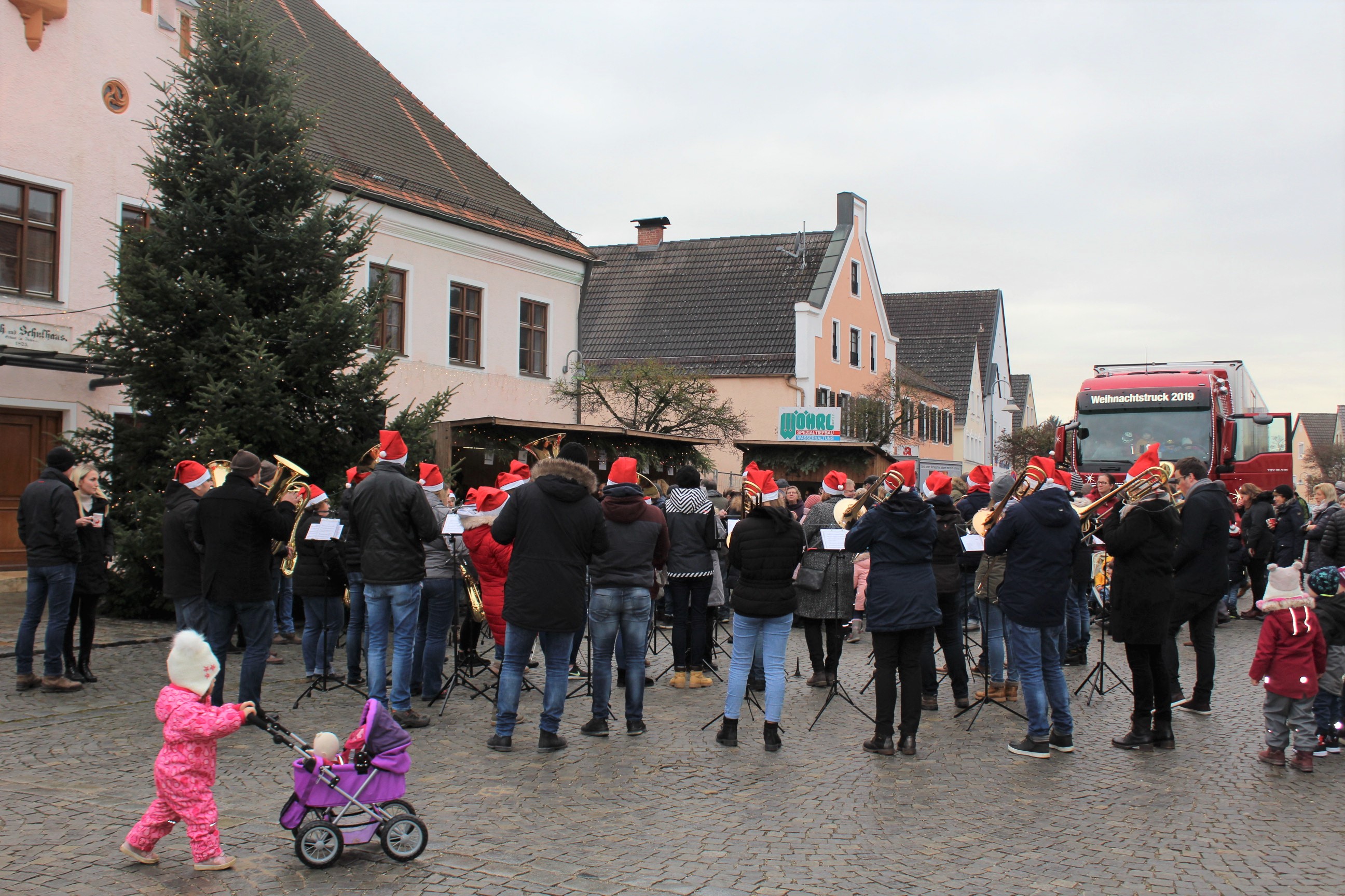 (ty) Der MAN-Weihnachts-Truck war am Wochenende in Hohenwart zu Gast. Drumherum hatte die Gemeinde-Verwaltung mit Hilfe der hiesigen Marktkapelle am Samstag wieder ein kleines Event organisiert. Das Rathaus wurde an diesem Tag besonders illuminiert, es gab Glühwein, Punsch und andere Getränke sowie Bratwürstchen und Crêpes. Bereits ab 13.30 Uhr konnten sich die Buben und Mädchen mit Disney-Weihnachtsfilmen auf das bevorstehende Fest einstimmen. Nach einem ersten Standkonzert der Kapelle begrüßte Bürgermeister Manfred Russer (CSU) vor dem Rathaus die Gäste. Anschließend folgte mit dem Besuch des Hohenwarter Christkindls ein Highlight für die kleinen Besucher.