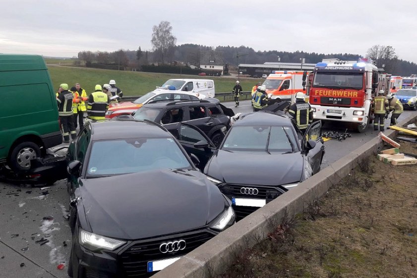 Ein 32-jähriger Fahrer eines Audi A6 aus dem Landkreis Ulm sei in seinem Wagen eingeklemmt worden. Er wurde nach der Erstversorgung vor Ort mit einem Rettungs-Hubschrauber in eine Münchner Klinik geflogen. Ein 30-jähriger Mini-Fahrer sei ebenfalls schwer verletzt worden. Er wurde mit einem weiteren Rettungs-Helikopter ins Klinikum nach Augsburg geflogen. Weitere vier verletzte Insassen aus anderen beiteiligten Fahrzeugen seien mit Rettungs-Fahrzeugen in umliegende Krankenhäuser gebracht worden.