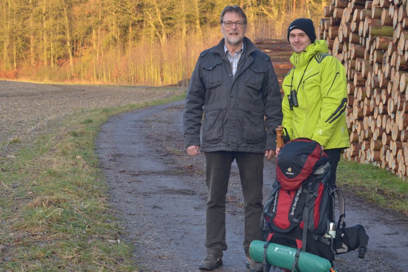 (ty) Tobias Rossmann aus Gosseltshausen (Foto oben, rechts) unternimmt derzeit eine mehrtätige Winterwanderung – inklusive Übernachtungen im Zelt – durch den Landkreis Pfaffenhofen, um auf den Flächenfraß aufmerksam zu machen und um für den Erhalt der Natur zu werben. Der Pfaffenhofener Landrat Martin Wolf (CSU, links im Bild) begleitete den jungen Mann dabei einige Kilometer durch Prambacher Wälder. Wolf begrüßt nach eigenem Bekunden die Initiative von Rossmann.