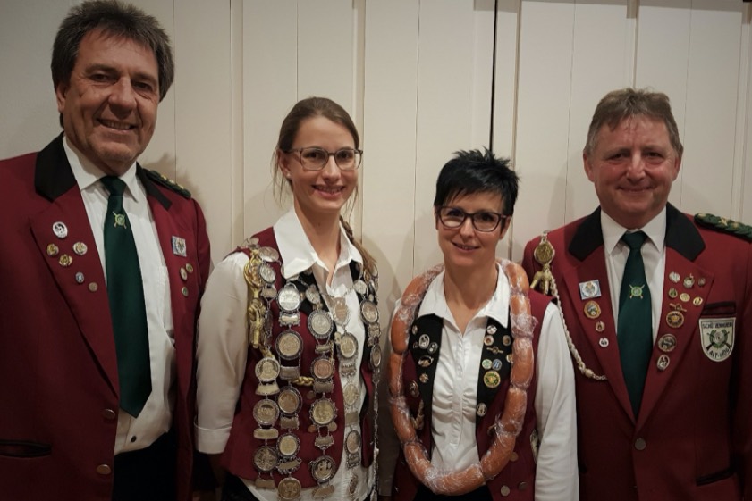 (ty) Viel Freude und lachende Gesichter hat es bei der diesjährigen Königs-Proklamation des Schützen-Vereins Alt-Hög gegeben. Anja Weber (Foto oben, Zweite von links) verteidigte ihren Königstitel mit einem 61,1-Teiler. Neue Vize-Schützenkönigin wurde Christine Ganzer mit einem 133,1-Teiler. Zu den ersten Gratulanten gehörten der Erste Schützenmeister Erwin Strasser (links) sowie der Erste Sportleiter Gerhard Weber (rechts).