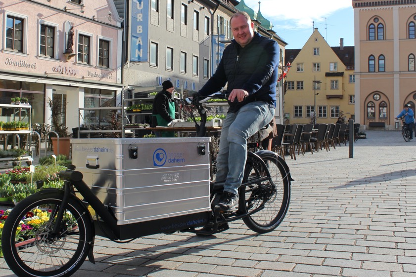 Mit einem Lasten-E-Bike kann man einiges transportieren. Hier ist Philipp Schleef von der städtischen Wirtschafts- und Service-Gesellschaft (WSP) auf einem solchen Gefährt unterwegs.