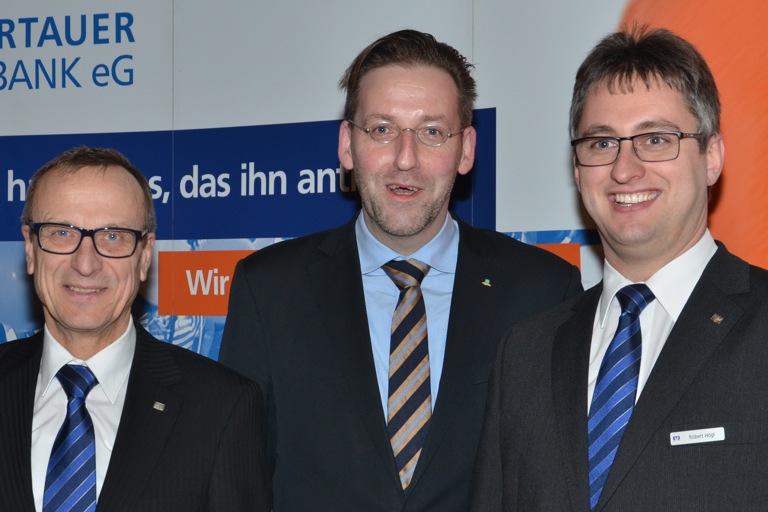 Die Redner beim fünften Landwirtschaftsforum der Hallertauer Volksbank in der Stadthalle Mainburg: Walter Zillner, Vorstandsmitglied der Hallertauer Volksbank (von links), sowie Dietrich Holler, Kommunikationsleiter der Deutschen Landwirtschaftsgesellschaft, und Robert Högl, Firmenkundenbetreuer für Agrar und erneuerbare Energien bei der Hallertauer Volksbank.