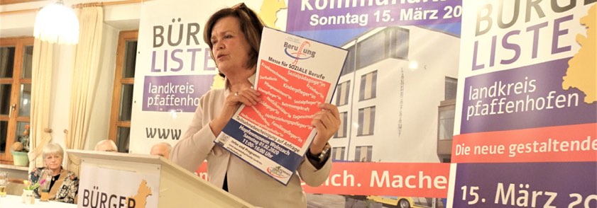 Vor dem Hintergrund des Fachkräfte-Mangels bei den Pflegeberufen werben Kaindl und die Bürgerliste für die anstehende "Sozialmesse" in Wolnzach (Große Info-Messe für soziale Berufe am 1. Februar in Wolnzach). "Politik und Gesellschaft müssen Pflegeberufen in allen Sparten – egal ob in den Kindertagesstätten, in den Kliniken oder in den Seniorenheimen – einen höheren Stellenwert beimessen", unterstreicht Kaindl. Quereinsteigern in den Pflegeberufen müsse man den Neustart erleichtern. Hier brauche es neben der geplanten Verbesserung der Berufsausbildung auch "neue Standards für Menschen, die in einem fortgeschrittenen Lebensabschnitt in den Beruf einsteigen".